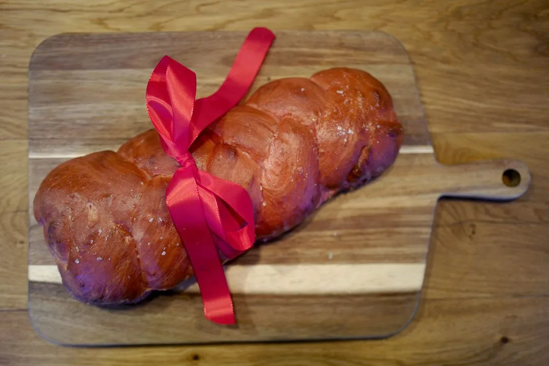 Bind julesløyfe rundt brødet og sett det på en fjøl slik at man kan skjære det opp ved bordet.