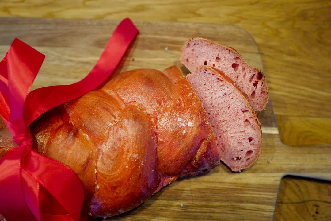 Du kan farge brøddeigen din med rødbetejuice eller konditorfarge. Du kan faktisk bake med rødbeterestene etter juicepressing også. Her har jeg en oppskrift på det.
