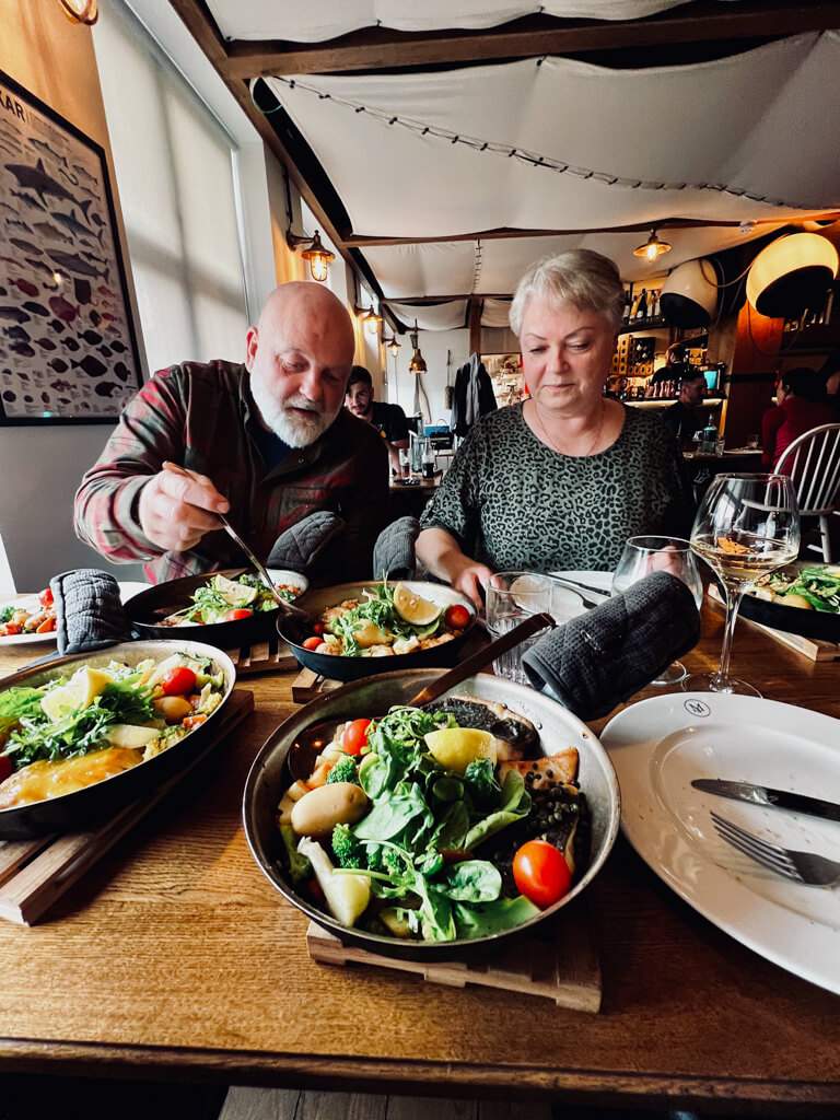 Vi nådde akkurat middag med tante Tove og kusine Karen i Selfoss på fiskerestauranten Messinn Selfossi der vi spiste nydelig, sprellfersk fisk.