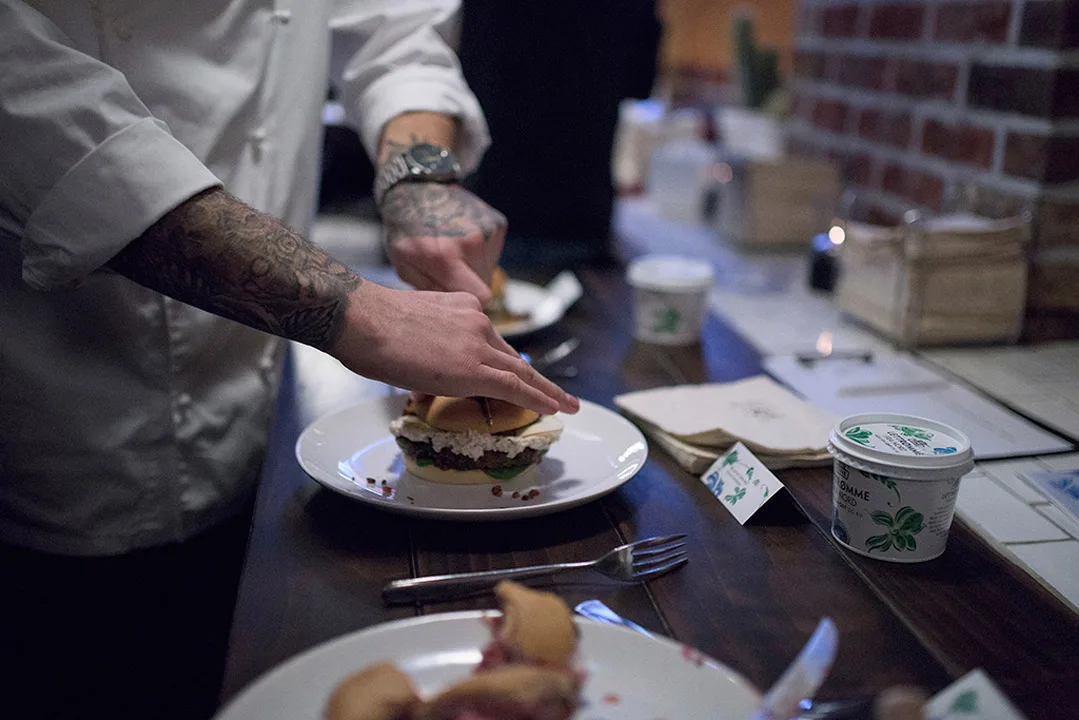 Mandag var jeg med i en burgerkonkurranse på Burger Joint som ligger på Aker Brygge i Oslo. Et utvalg matbloggere (bl.a Tjodunn fra smakenavoslo.no, Julie fra juliesmatblogg.no og Suzanne Aabel fra suzanneaabel.blogg.no, som strengt tatt ikke er en matblogg, men det blir kanskje det neste?) møttes på det trange kjøkkenet for å lage sin versjon av det som skal bli månedens burger – som er å få kjøpt på Burger Joint i hele desember.