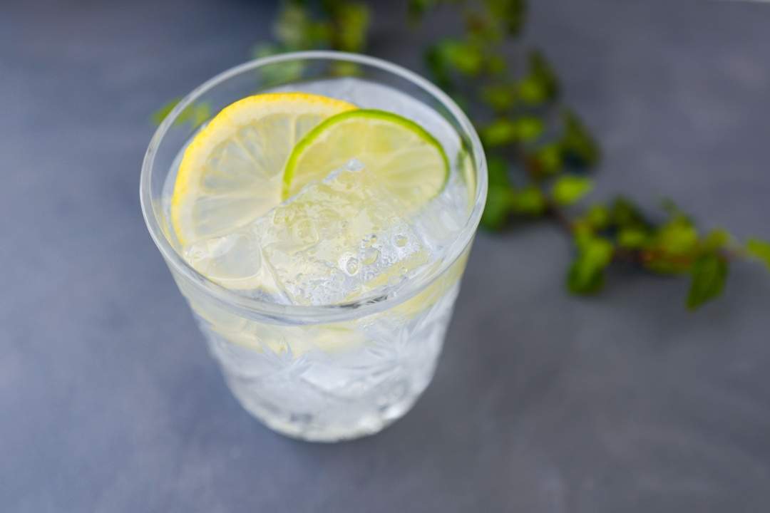 Ha masse isbiter i et glass. Hell på Meir No.1 Aquavit og iskald tonic. Bland forsiktig og pynt med lime og sitron.