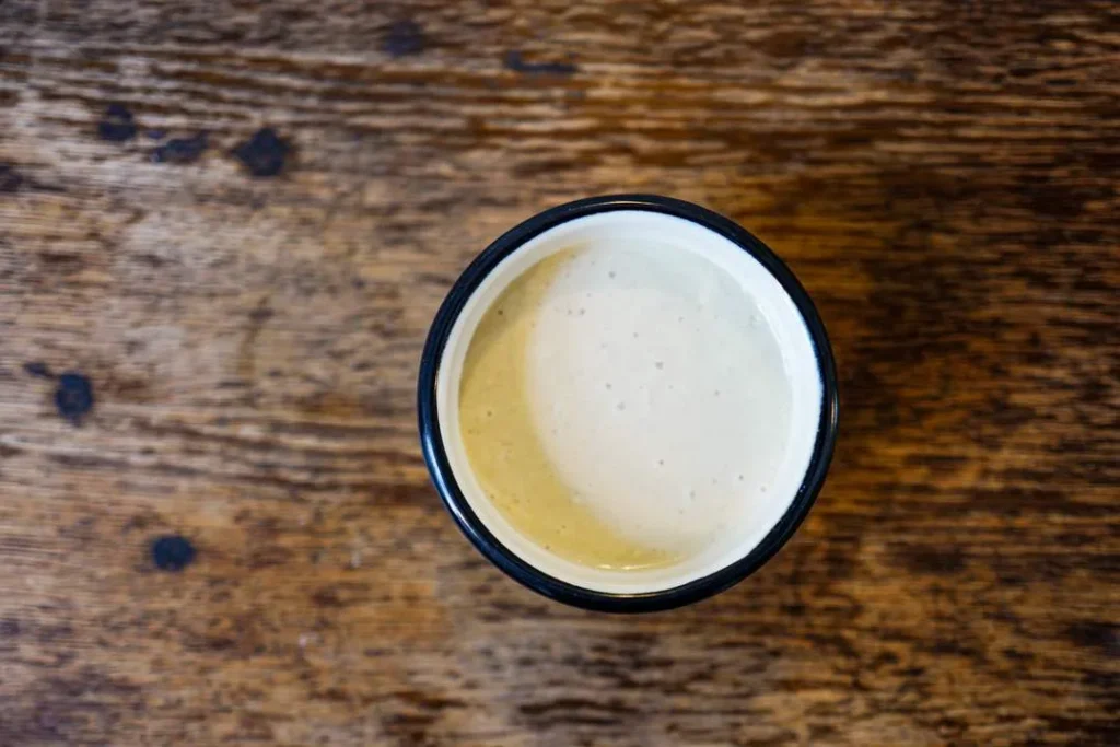 Bruk en stavmikser og bland Bakemjølk, olivenolje, disjonsennep, majones og ansjos.