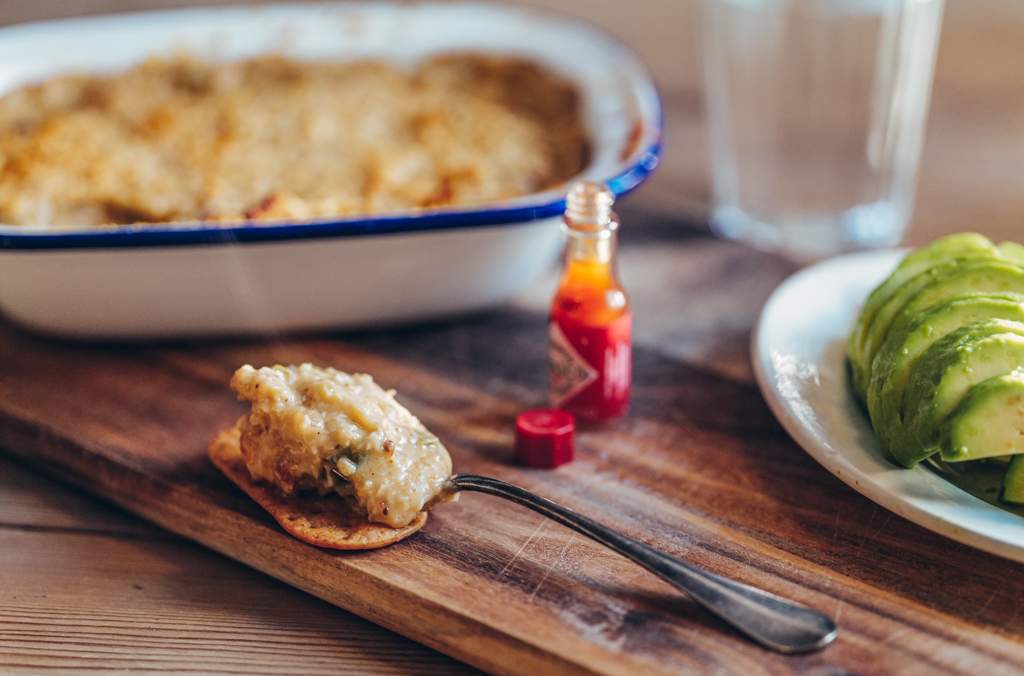 - I en gryte smelter du smør. Pisk inn melet og rør godt noen minutter. Spe med melk og kok opp og rør til sausen tykner. Ha i 1/3 av osten. Rør inn i sausen. Ha i grønnsakene og krabbekjøttet. Smak til med salt og mer krydder. Rør sammen og ha i formen(e). Strø ost og litt brødrasp over. Ringle litt olje over og sett i ovnen i ca 15-20 min. Server med kjeks og avokadoskiver + hotsauce som snacks eller forrett.