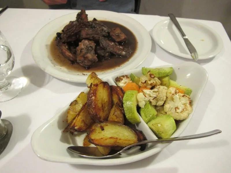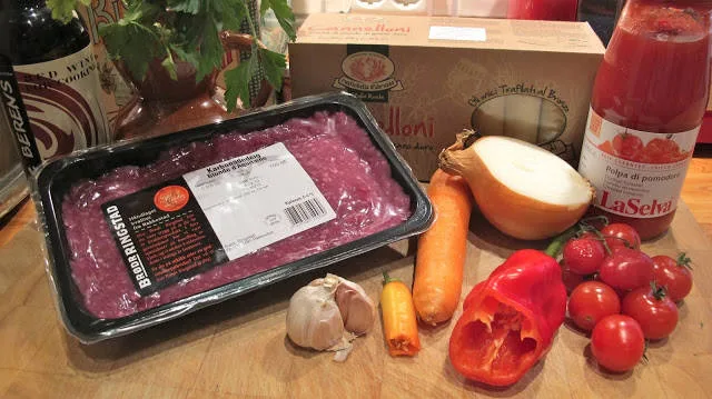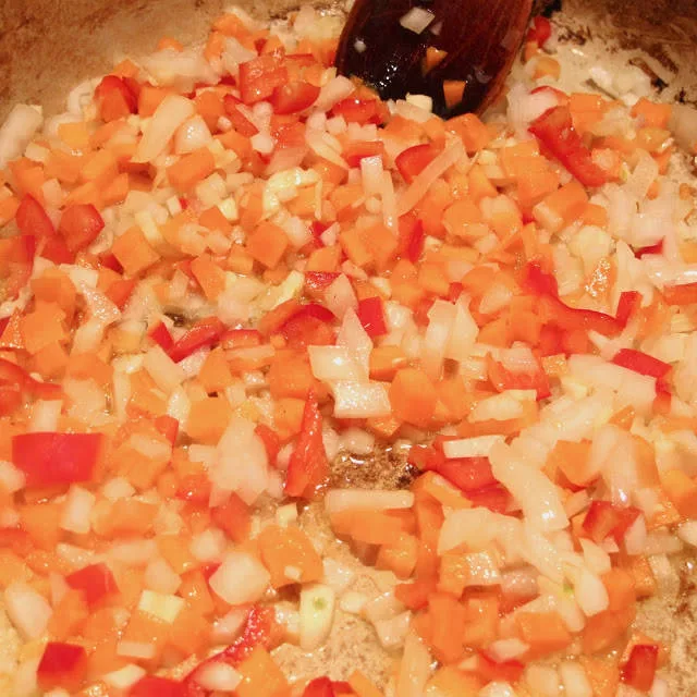 | Løk, hvitløk, gulrot, chili og paprika surres i olivenolje og litt salt i 10-15 minutter til løken er blank og nesten gjennomsiktig. Stek karbonadedeigen i en panne og tilsett i løkgryten. Mål opp 2 ss tomatpuré og bland i gryten. Slå over 1 glass rødvin og la alkoholen dampe av. Så tilsetter du en flaske tomater og etterpå fyller flasken med vann og heller den i gryten. Tilsett litt pepper og halve tomater. Jeg tilsatte også en neve grovhakkete sorte oliven, men det kan du velge selv om du vil ha i retten eller ikke. Tilsett finhakket persille og sett gryten på medium varme i min. 1 time. Rør av og til. Smak til om det trengs mer krydder. |