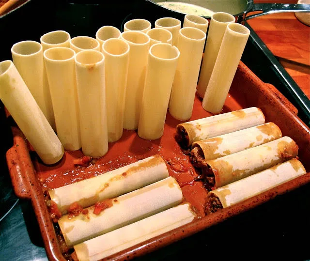 Så fyller du cannelloniformene med kjøttsausen og legger dem forsiktig i en smurt form. Blir det litt kjøttsaus igjen kan du bare hele det over rørene.