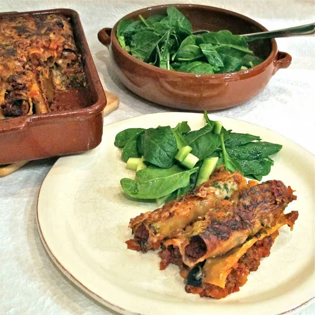 | Cannelloni med kjøttfyll servert med en spinatsalat med agurk. Enkelt og greit. |