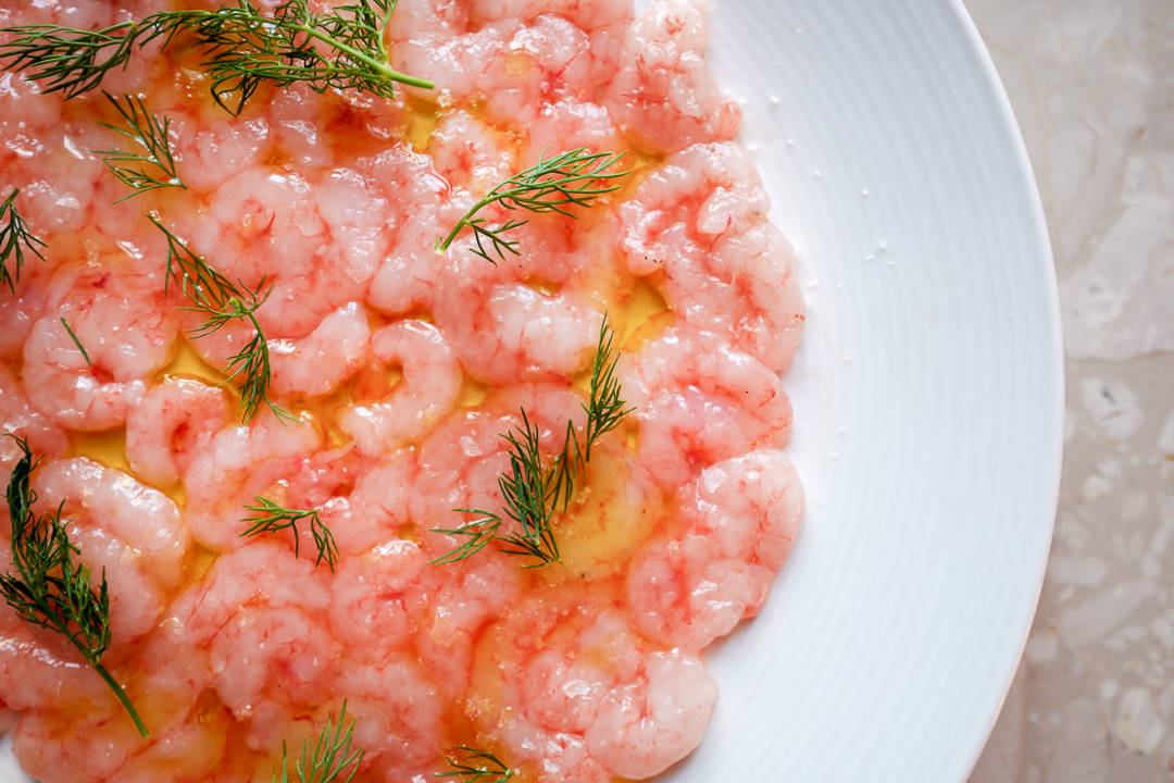 Nå trenger vi å smakssette rekene. Hell god extra virgin olje over. Dryss flaksalt over og pynt med dill. Press litt sitronsaft over for å tilsette retten litt syre.