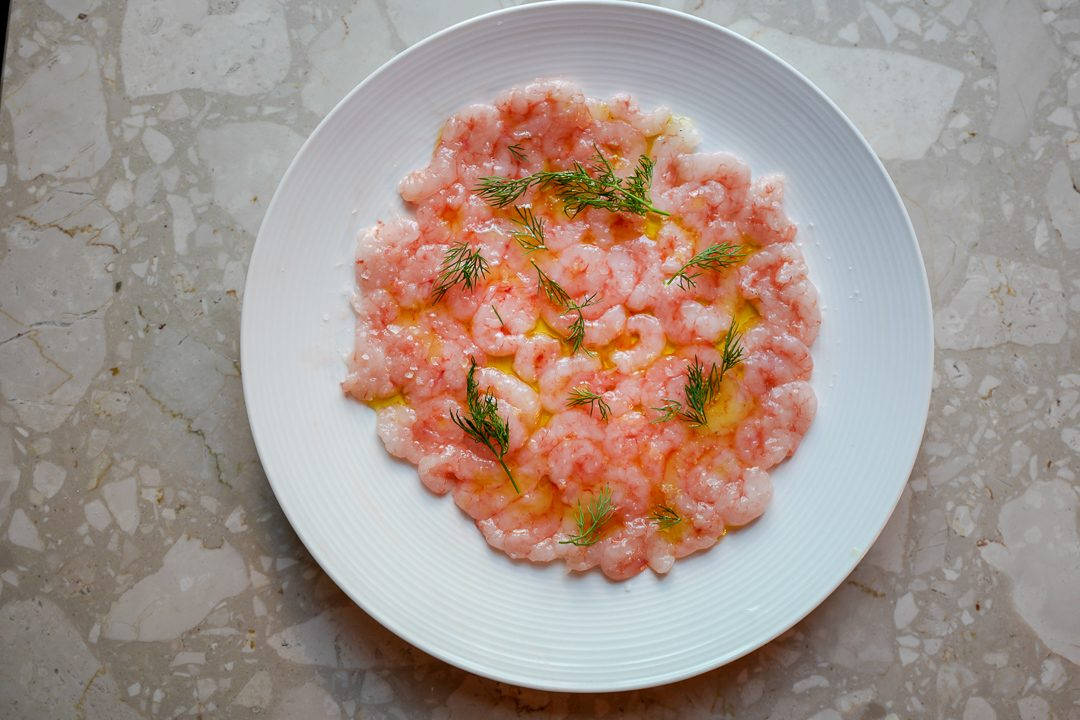 Når du har pillet rekene legger du dem tett i en rund form med plastfolie under og over. Bank forsiktig med en kjøtthammer slik at rekene blir litt flatere. De vil da klistre seg litt sammen – noe som er bra. Dra forsiktig av det øverste laget med plast og legg en tallerken på toppen. Vend den mens du holder hånden på plasten. Nå ligger rekecarpaccioen på fatet og du kan forsiktig dra av det andre plastlaget.