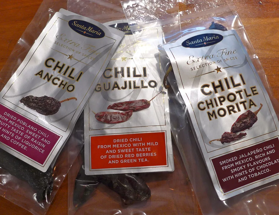 Chili ancho: tørket poblanochili fra Mexico som smaker søtt og fruktig som rosin, lakris og kaffe.