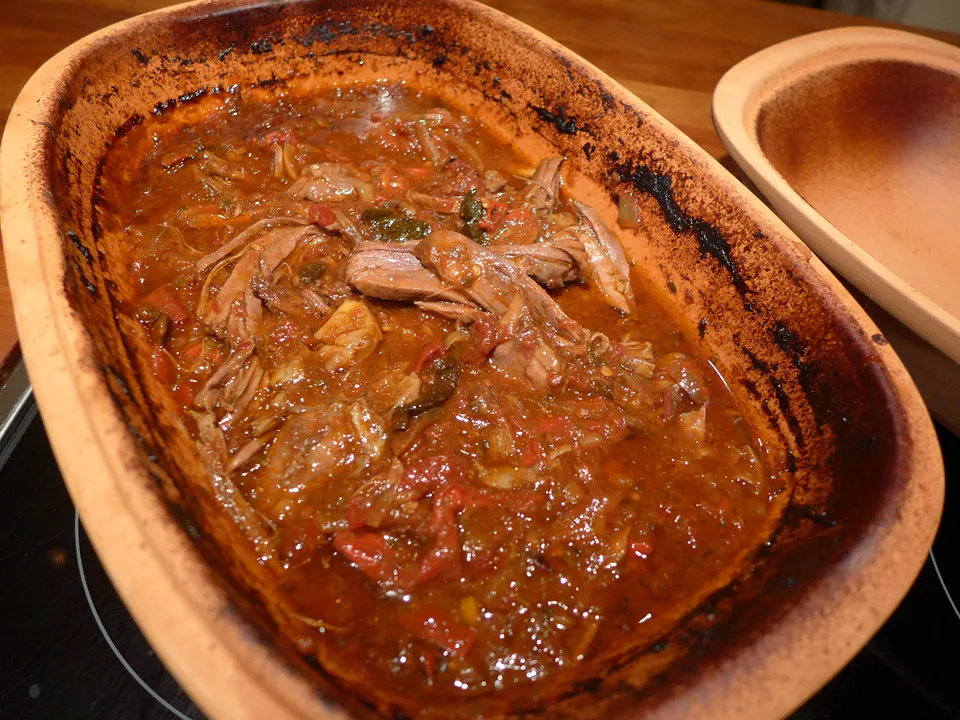 Legg alle ingredienser i en leirgryte med lokk eller en annen ildfst form med lokk. Sett i en forvarmet ovn på 150 grader i 4 timer. Skru ned temperaturen til 120 grader og la gryta stå to timer til. Nå kan du ta av lokket og dele kjøttet med to gafler.
