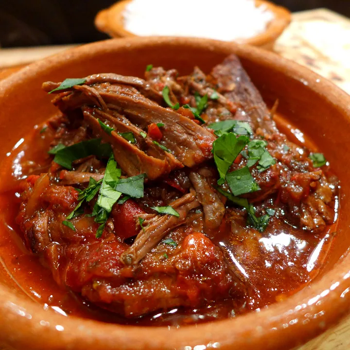 Denne versjonen av chili con carne er laget av tre typer tørket chili (chipotle morita, guajillo og ancho), grønn fersk chili og rød paprika, mørk sjokolade og uten bønner.