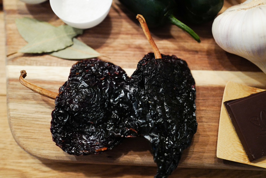 Ancho chili (heter også poblano) er søt og finnes i tørket form. Den legger man i lunket vann i 30 minutter for at den skal mykne. Nå kan den hakkes.
