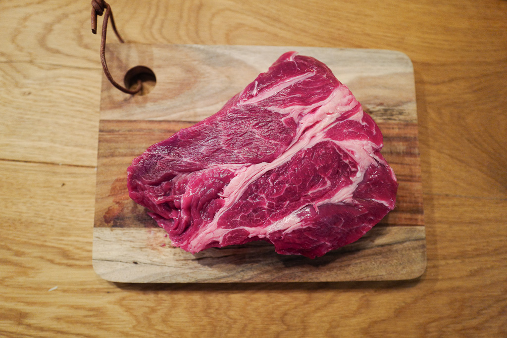 600 g høyrygg av storfe, helst økologisk. Del stykket i store terninger.
