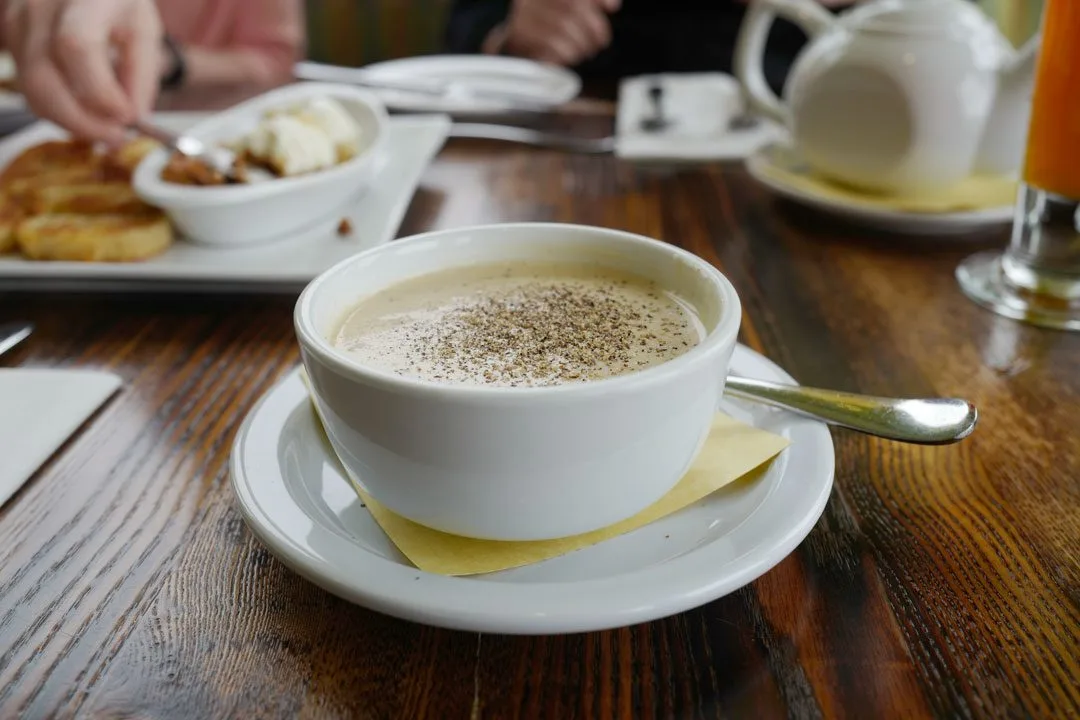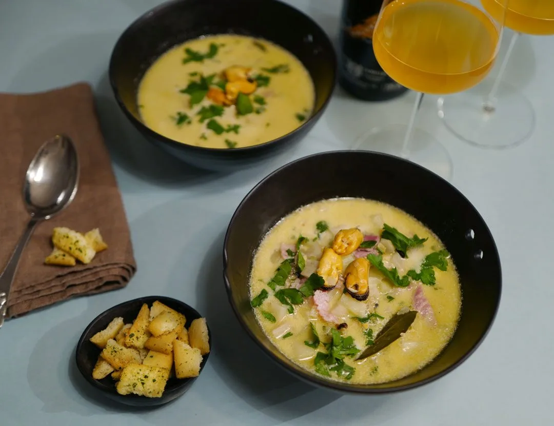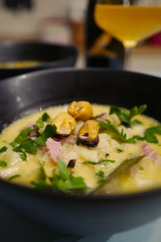 De var skikkelig gode på krabbe og østers, men også den berømte skalldyrsuppen Clam Chowder var de helt rå på. Så god suppe! Det er nesten en gryte, for den er ganske pakket med deilige ting. Du kan lage den med hjerteskjell, men et billigere alternativ og et vel så godt alternativ er blåskjell. Du får masse deilig kraft og masse kjøtt.