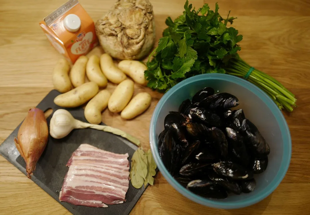 Ha blåskjellene i gryta og legg på lokk. Når blåskjellene er åpnet (det tar ikke mange minutter) heller du kraften over i en gryte. Blåskjellene pilles ut av skjellene. Ta var e på så mye av løken som mulig. Grovhakk blåskjellene og sett til side (spar noen til pynt).