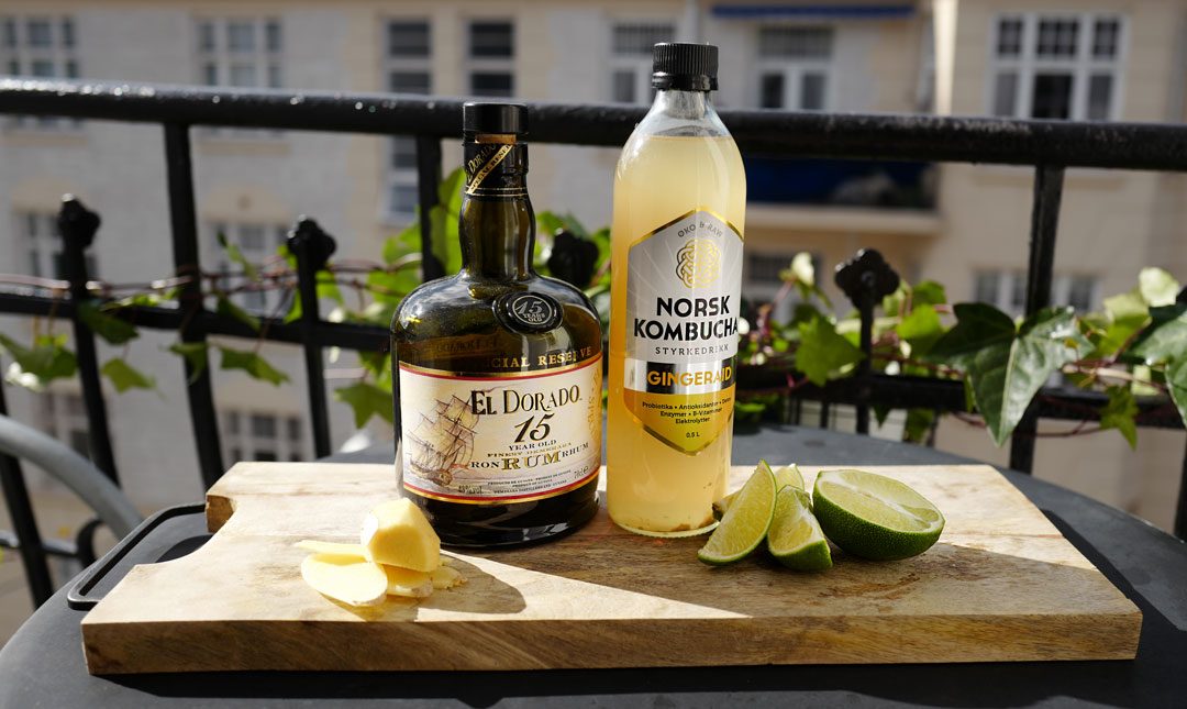 Jeg har brukt en økologisk «gingeraid» fra Norsk Kombucha som et alternativ til ingefærøl. Det finnes mange merker på markedet. Jeg liker smaken på akkurat denne med ingefær og foretrekker den i dennne drinken.