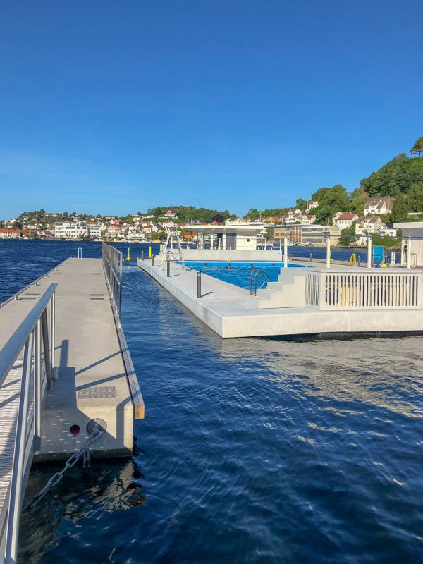 Bassenget er åpent fra klokken 07:00 og jeg og en journalistkollega vandrer i morgenkåpe ut fra hotellet og ned til havnen. Det var det visst ikke så mange som hadde gjort før oss, for her var det lange blikk og latter. Det kunne vi liksom ikke bry oss med, så vi gikk med hodene hevet og havet som mål. Vi hoppet ikke i havet altså. Så tøffe var vi ikke, men vi prøvde det flotte oppvarmede utendørsbassenget. Så deilig og så forfriskende.