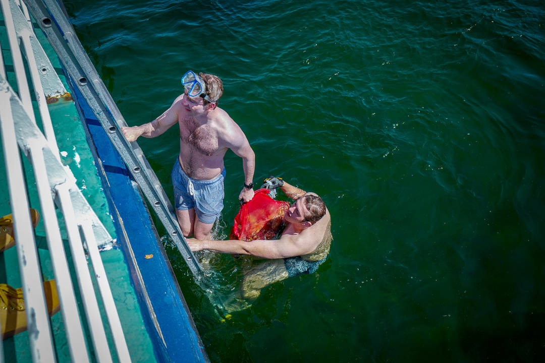 På Tromlingene hopper østersjegene Christoffer og Jens Patrick i vannet og svømmer ut til østersbankene. Etter ca 20 minutter svømmer de tilbake til båten med tung sekk.