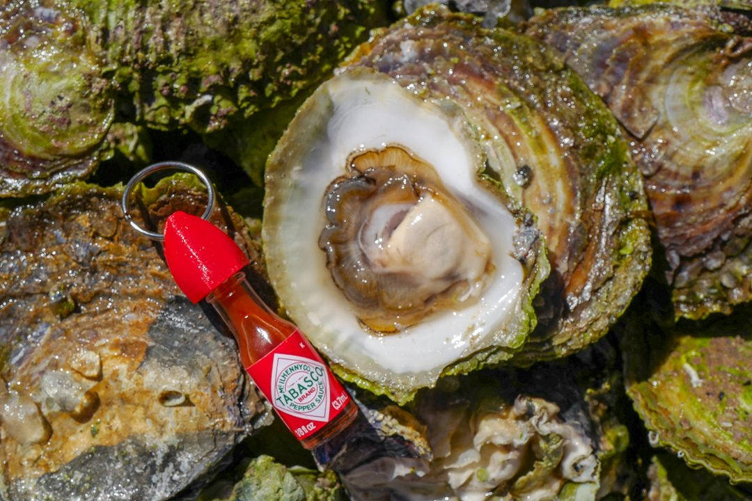 Jeg må selvsagt spise én rett fra havet med en liten dråpe Tabasco. Jeg har min egen lille flaske med i vesken slik at jeg alltid er beredt i tilfelle det skulle reke en østers min vei – slik som denne dagen.