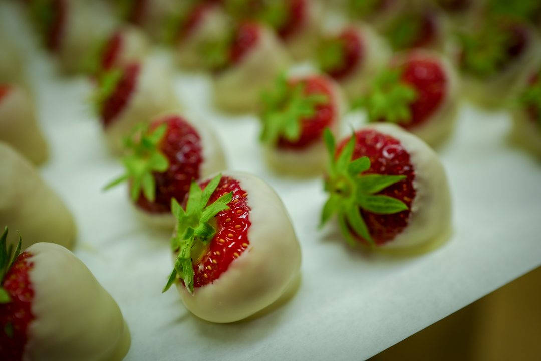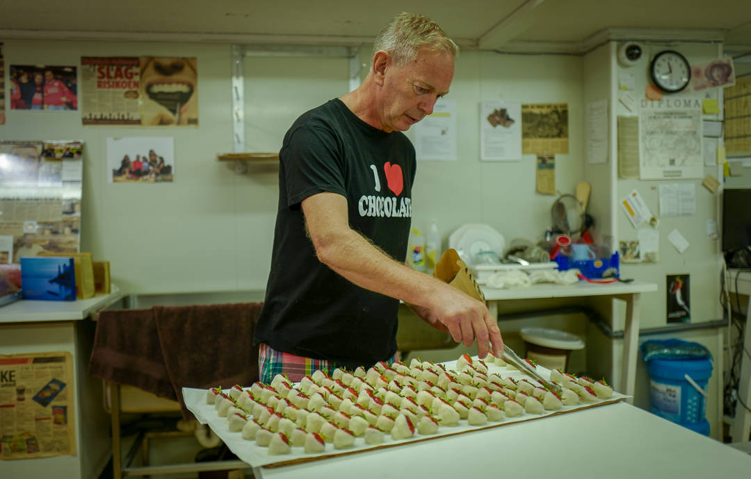 Når jeg kommer innom gjaller Pink Floyd over anlegget. – Det er fint med god musikk når man jobber, sier Morten som byr på nydyppede jordbær i hvit sjokoladetrekk.