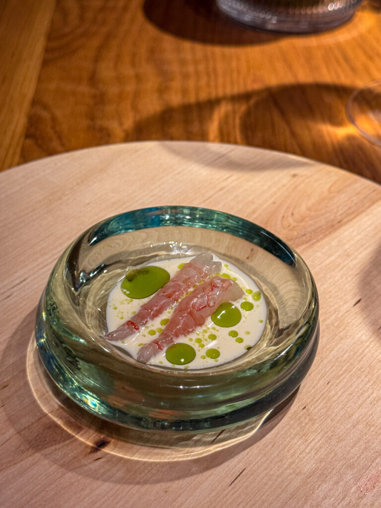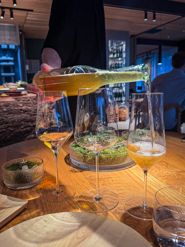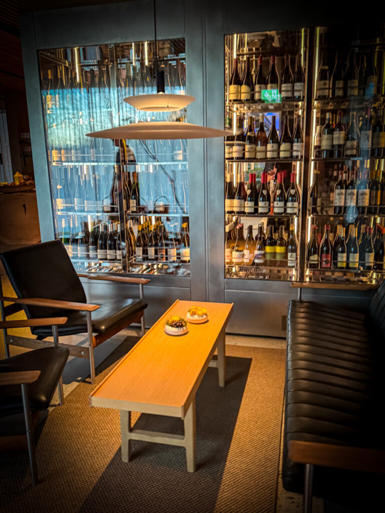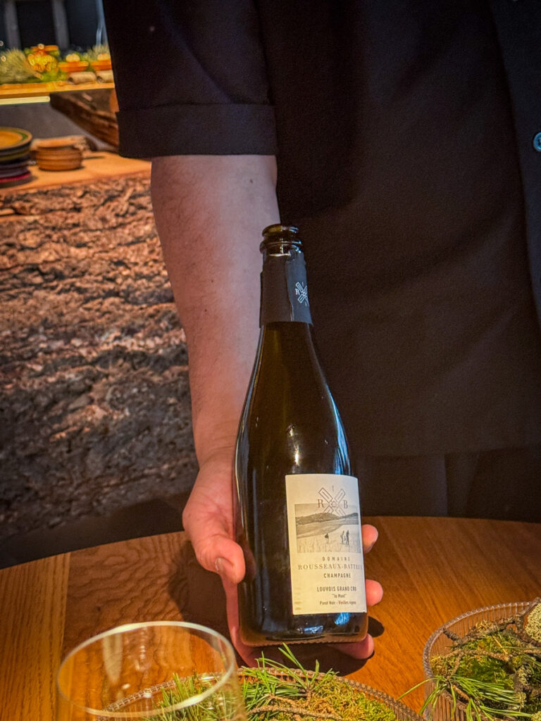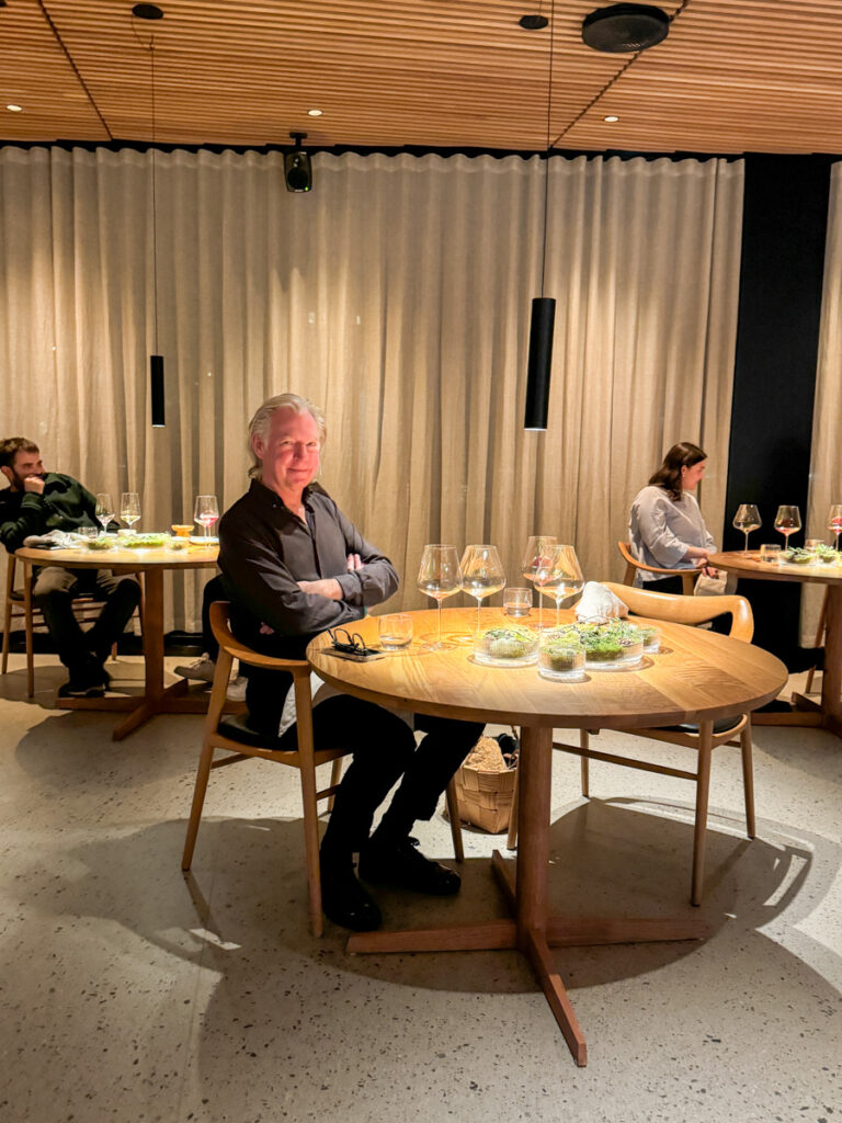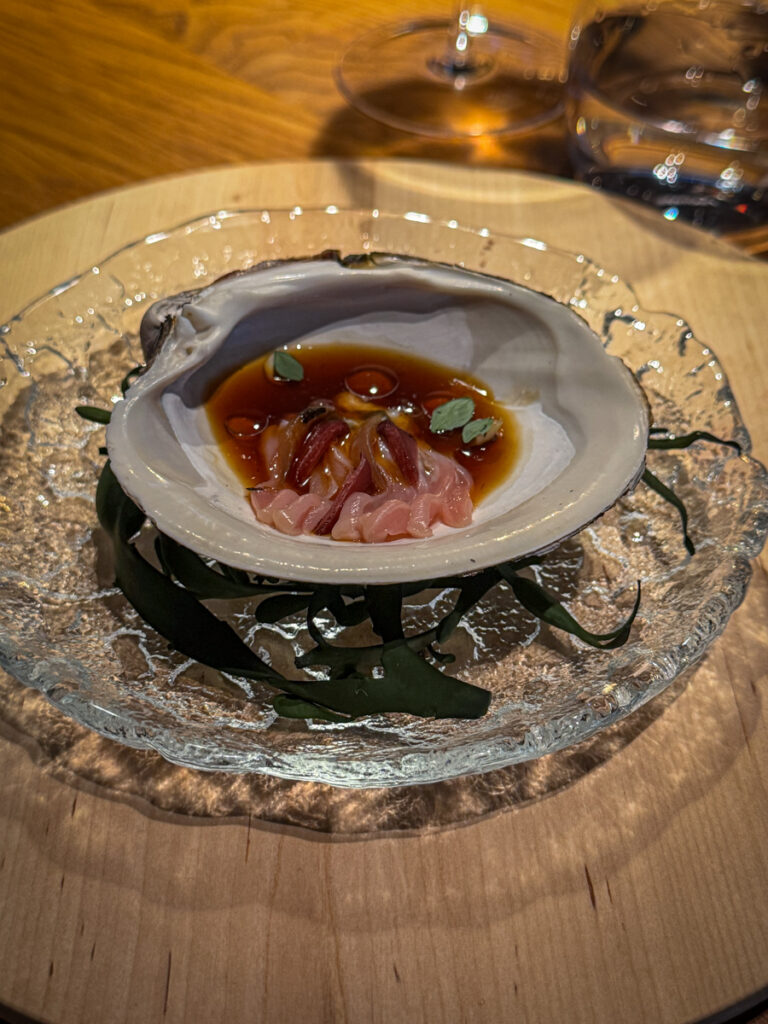 Vi får et glass Rousseaux-Batteux Blanc de Noirs Extra Brut Champagne når vi setter oss og nesten umiddelbart sjekkes et glass Veyder-Malberg Wösendorfer Ried Hochrain Grüner Veltliner 2023. Det er en litt forvirrende start der vi egentlig ikke vet helt når champagnen skal drikkes og når Grüner Veltlineren skal inntas. Men vi må ikke glemme at teamet er helt nytt og de har ennå ikke helt funnet sin plass. Dette går seg til. Men når vi sitter der og bokstavelig talt drikker med begge hender begynner festen.