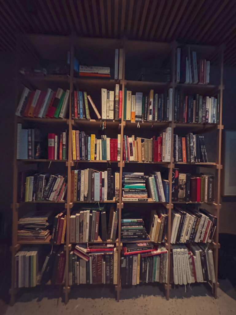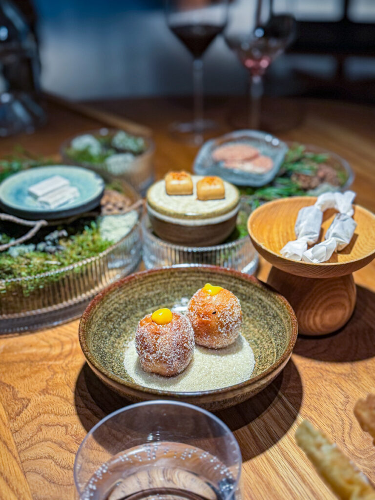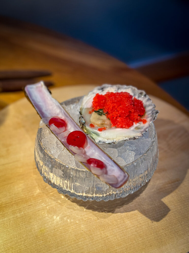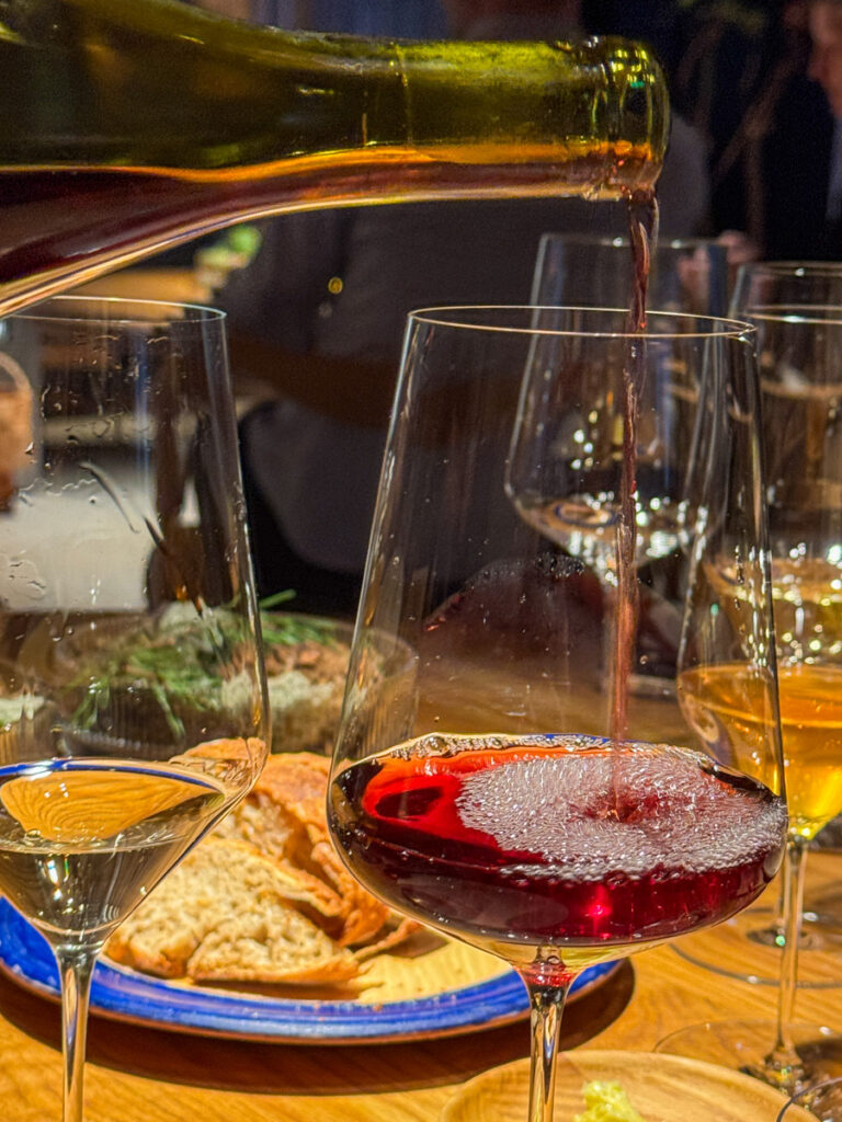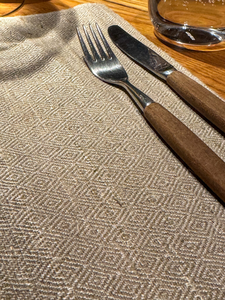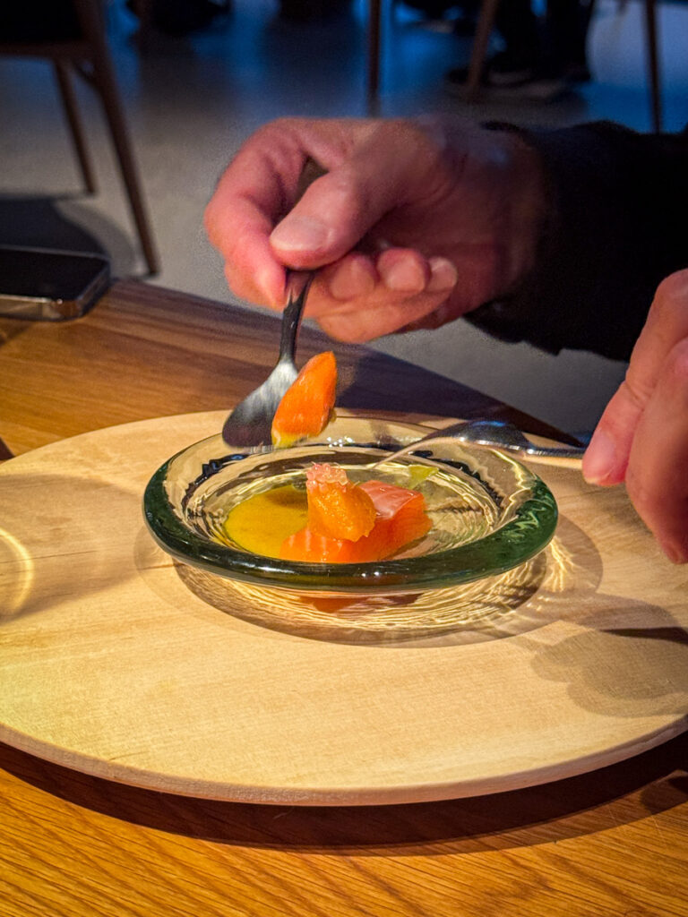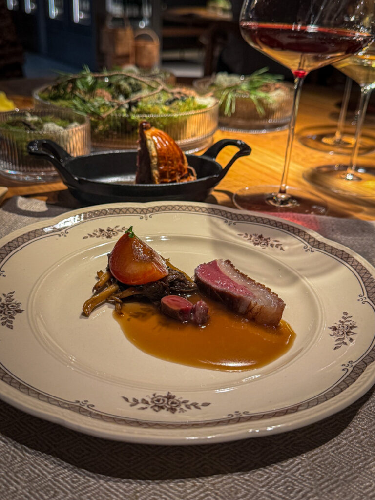 Vi får et glass Rousseaux-Batteux Blanc de Noirs Extra Brut Champagne når vi setter oss og nesten umiddelbart sjekkes et glass Veyder-Malberg Wösendorfer Ried Hochrain Grüner Veltliner 2023. Det er en litt forvirrende start der vi egentlig ikke vet helt når champagnen skal drikkes og når Grüner Veltlineren skal inntas. Men vi må ikke glemme at teamet er helt nytt og de har ennå ikke helt funnet sin plass. Dette går seg til. Men når vi sitter der og bokstavelig talt drikker med begge hender begynner festen.