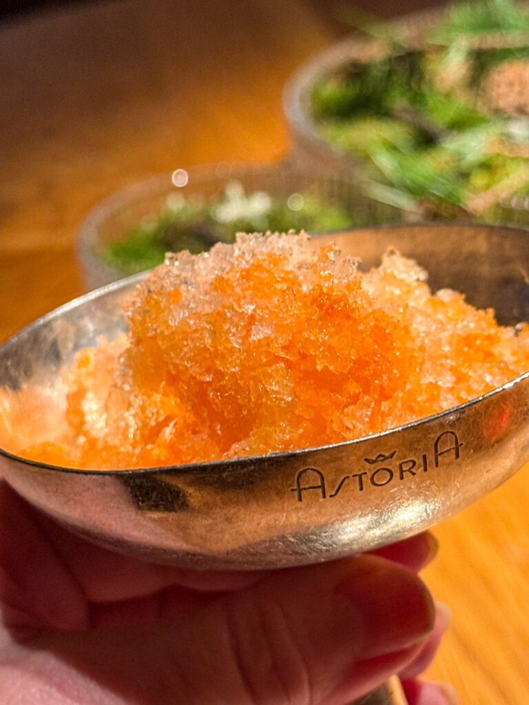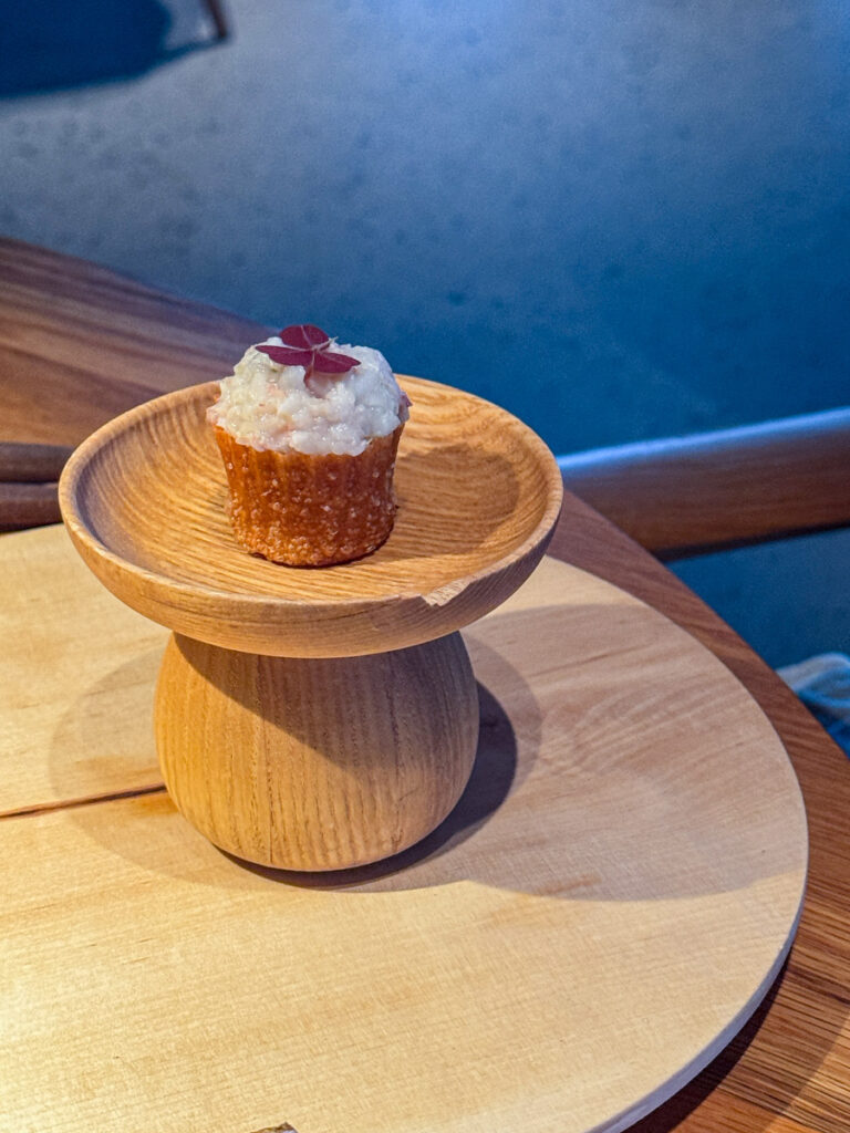 Når vi blir plassert ved bordet står allerede noen av rettene fremme. Det er uvant for meg at rettene allerede er servert og jeg vet ikke helt om jeg synes det er en god idé. Tanken er nok at man skal komme til et dekket bord. Og for all del. Det er vakkert. I små skåler finnes det beste av det beste fra norske farvann. Dette er den kalde sjømat-serveringen.