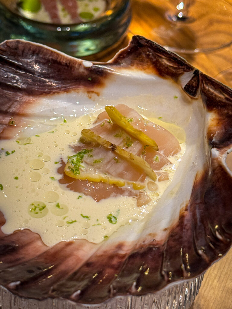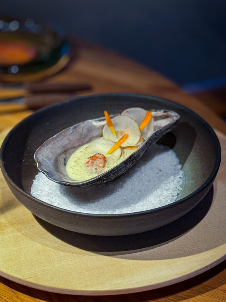 Vi er tilbake til den ordinære menyen og sjømatfesten fortsetter med o-skjell som serveres med en grillet, fløtebassert jordskokkfrikassé. Jeg får hint av tørrmodnet oksefett, men Heidi avslører at retten ikke inneholder denne ingrediensen, men at det er koreansk fermentert chilipaste, gochujang, i møte med grillen som gir disse tonene. Imponerende kjøttaktig og deilig er det uansett og en rett som igjen viser lekenhet og bevissthet til råvarene.
