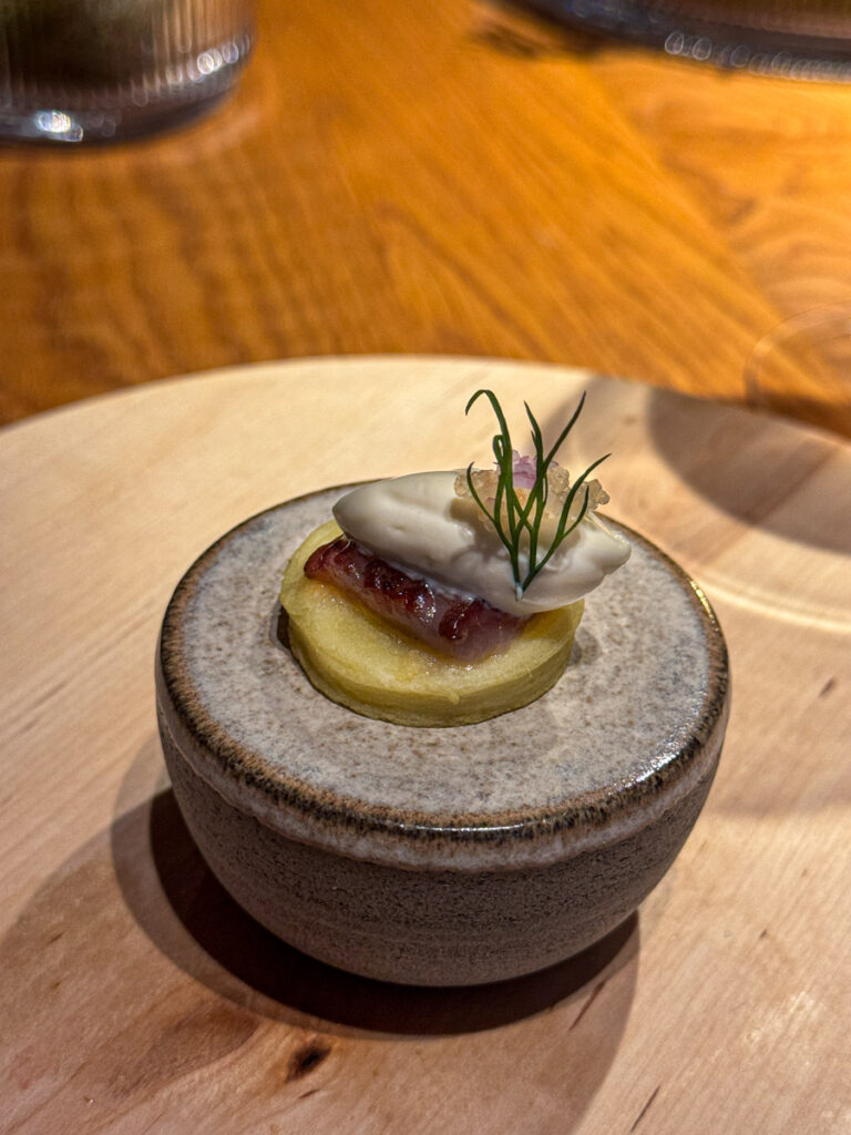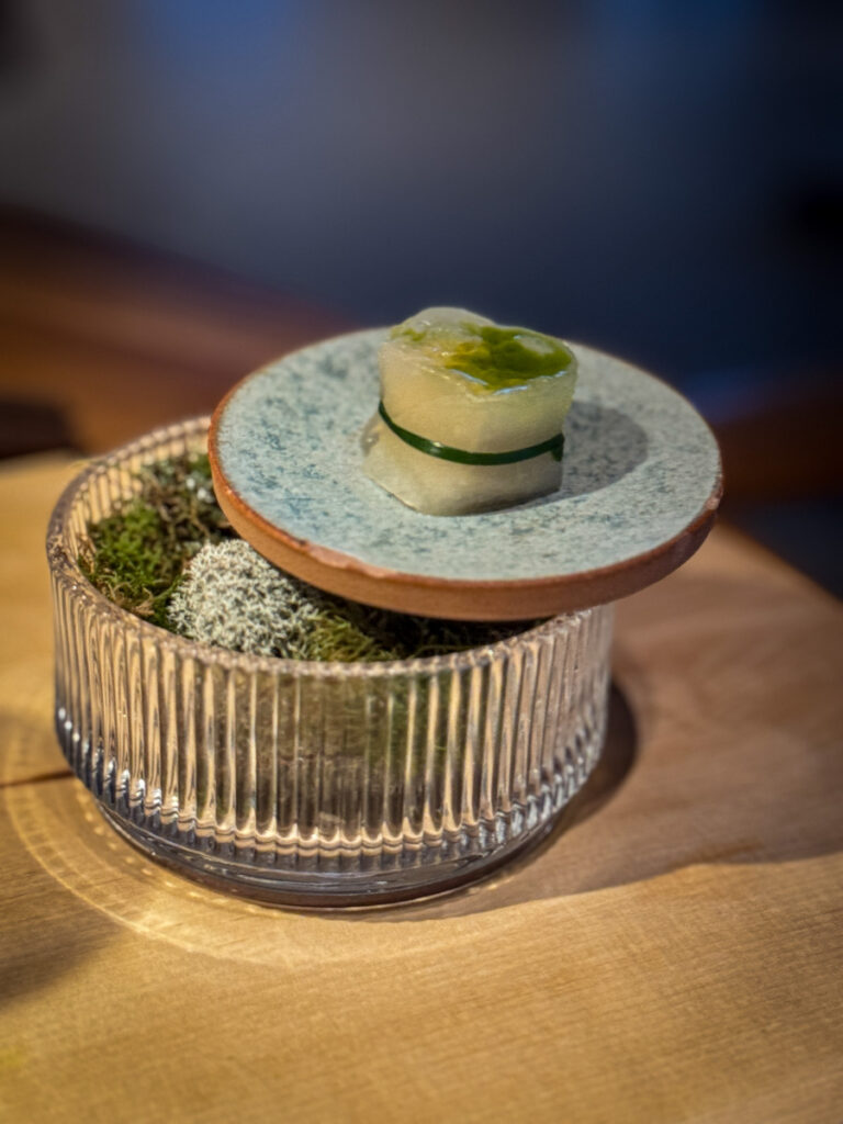 Flatøstersen får et lag med granité laget på vannmelonreddik fra Credos have, mens knivskjellet er toppet med skiver av saltet stikkelsbær. Visuelt er det svært vakkert og det smaker tilsvarende. Vi er kjent for å ha god sjømat i Norge, og her hadde det vært helt innafor med mer namedropping hva angår stedene råvarene kommer fra. På den annen side er det også befriende med lite info. Vi gis tid til å nyte maten, og det er også bra.