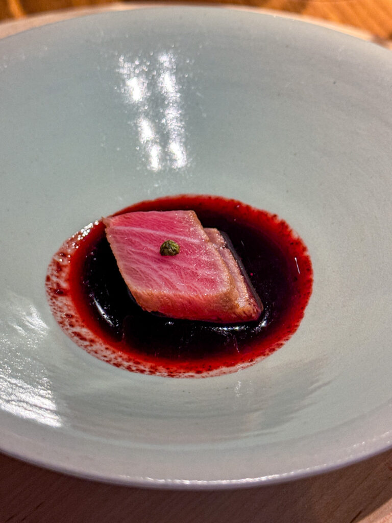 Heidi har fått inn en makrellstørje og derfor presenteres en rett som ikke er på menyen. Det er kanskje en av de aller beste og jeg håper hun finner plass til en variant på menyen ved en senere anledning for dette var smaker som hoppet i munnen av glede. Små stykker av toro, den feteste delen på tunfisken er såvidt varmebehandlet før det legges på en saus av blåbær, soya og einebær. Ai, for en lykke! For noen farger.