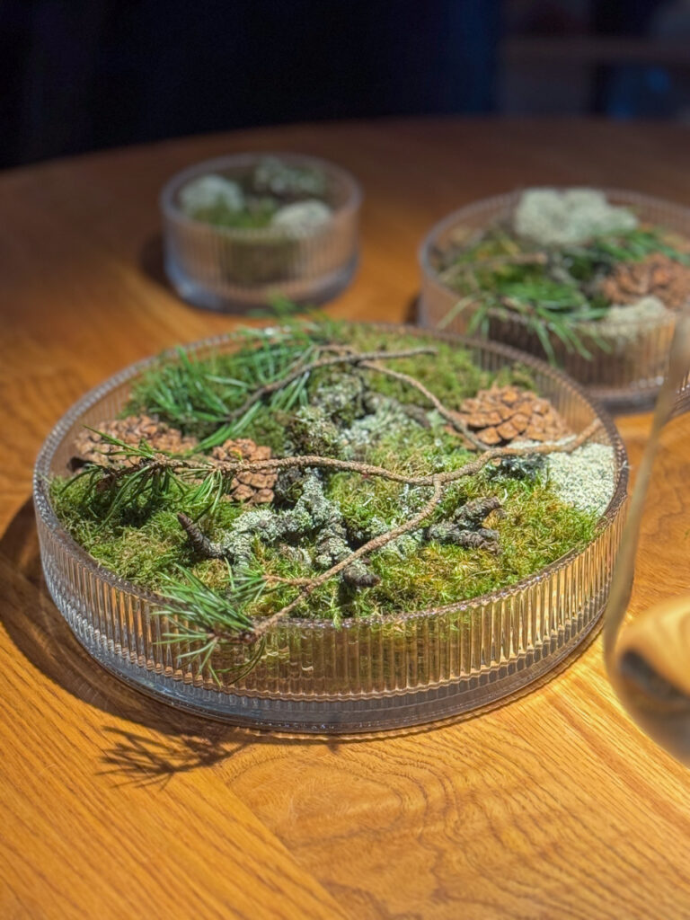 Selve restauranten kan ta maks 30 mennesker fordelt på cirka 10 runde bord, dekorert i stilren nordisk design. Vi har forhåndsbestilt meny med drikkepakke til henholdsvis 2400 kroner per person (maten) og 2000 kroner per person (drikken).
