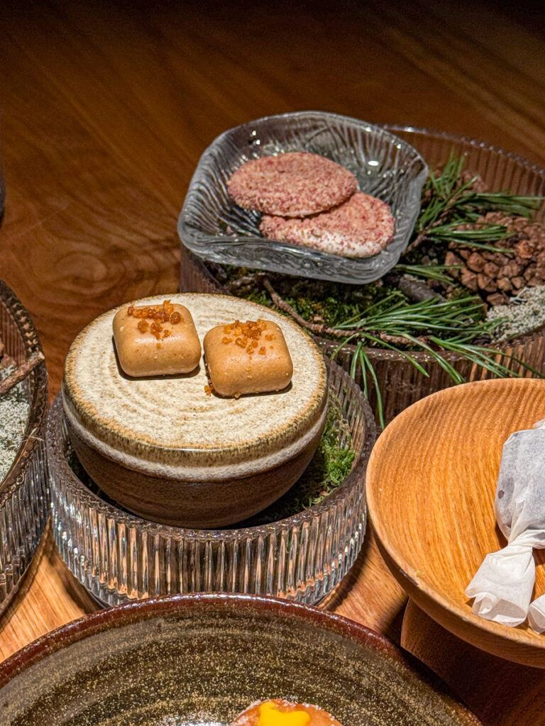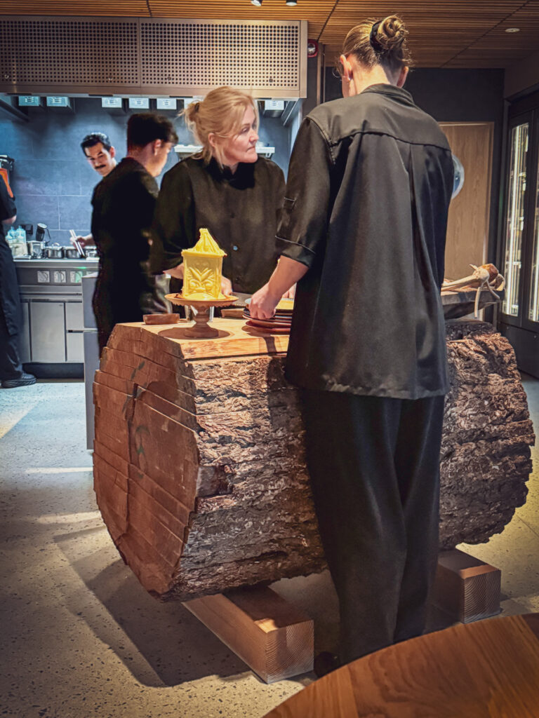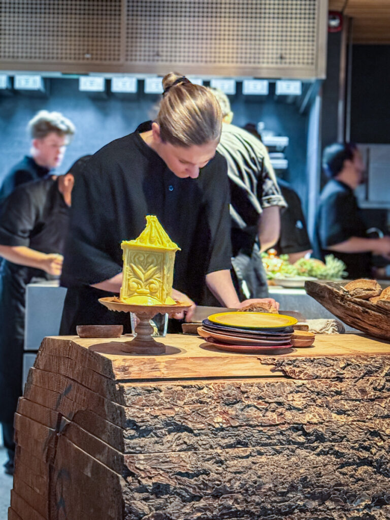 Når retten serveres får vi et stykke av lammesadelen som smelter på tungen, servert med traktkantareller, plomme og en innkokt pinnekjøttglace. Her snakker vi umami-slag rett i ansiktet. Men på en meget god måte. Jeg tar gjerne en slik dask når som helst. Genialt med pinnekjøttsausen og det syrlige innslaget av plomme som frisker opp. Retten serveres på Kajas bestemors service, og gjør hele serveringen hakket mer personlig og hyggelig. Dessuten ligger brikker av lin under tallerknene, og disse er det Jon Fredrik Skauge, tidligere bonde og leverandør til Credo i Trondheim som har vevd.