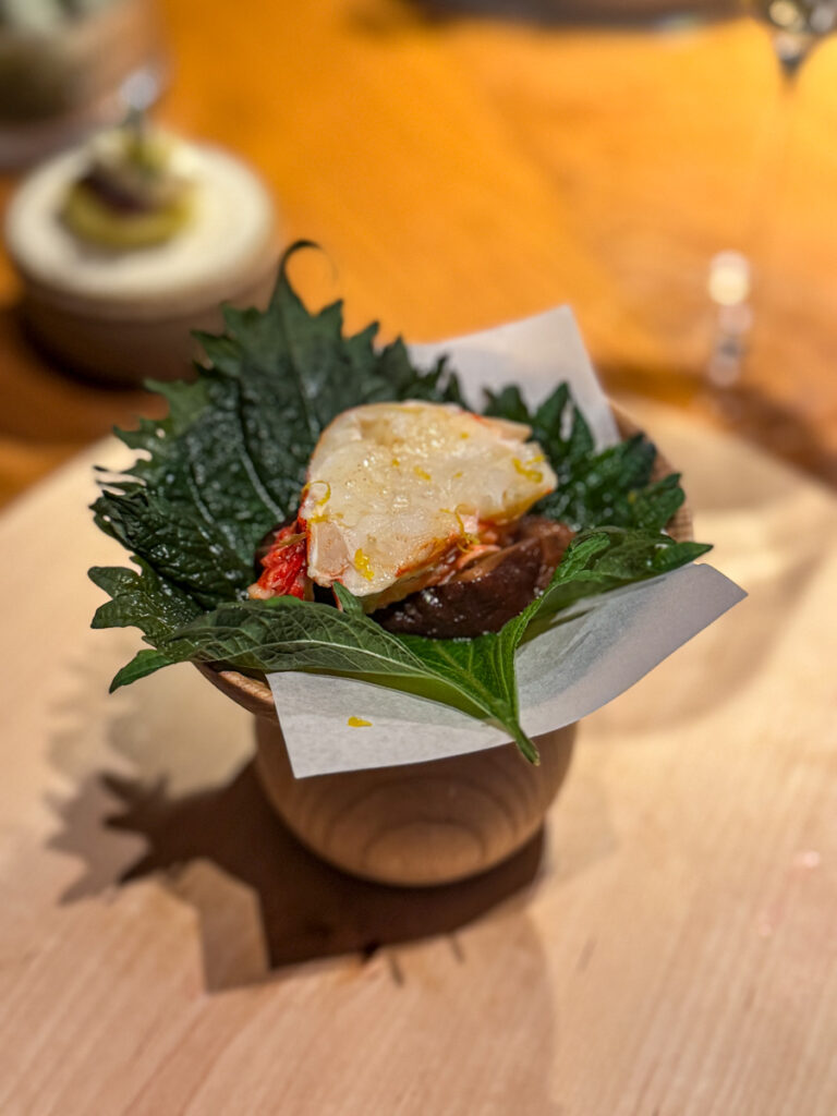 Måltidet er fullt av overraskelser og inn kommer nok en bonusrett bestående av norsk hummer med sopp på shisoblad der finrevet skall av fersk yuzu topper stasen. Og stas er det når man pakker den sammen som en taco og nyter den med hendene.