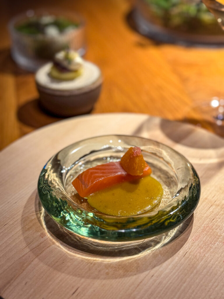 Et stykke lettrøkt ørret ligger delikat i en glasskål servert med gresskarpuré og curry laget av langpepper, som var et vanlig krydder her i Norge i Middelalderen før den vanlige sorte pepperen tok over på popularitetsbarometeret. Interessant tilleggsopplysning som jeg ikke ante noe om. Igjen en spennende rett som balanserer godt mellom salt og syrlig.