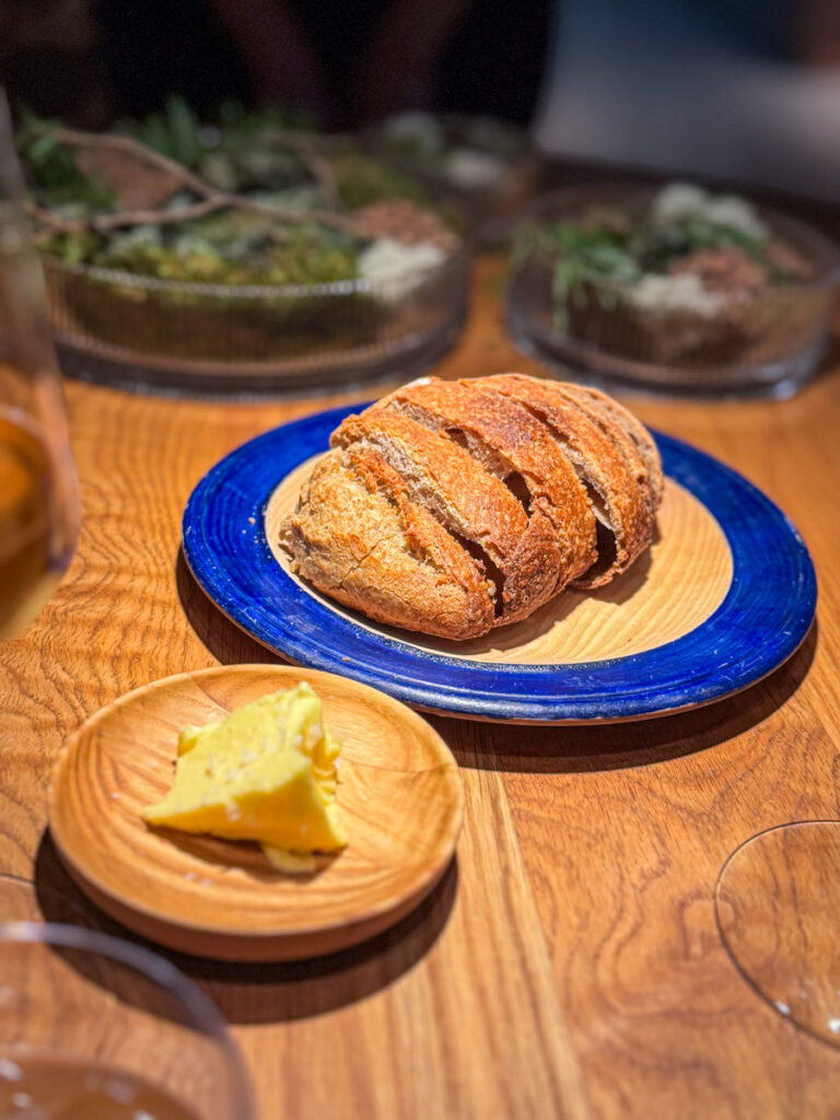 Kaja og Heidi tar sin tørn med å skjære brødet laget av urhvete. En servering av smør med et dryss flaksalt på toppen serveres med et surøl fra Ølsmia. Jeg digger surøl og jeg er faktisk glad for friskheten den gir brødet og smøret. Fordi vi handler brød fra bakeriet ganske ofte, spiser vi oss ikke mette på det og sparer heller plassen til de neste rettene. Men for de som ikke kjenner til bakeriet deres, anbefaler jeg å nyte baksten fullt ut.