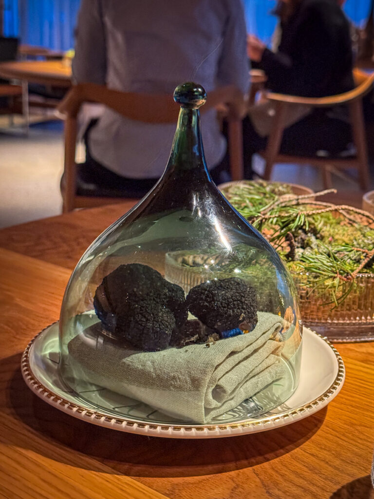 Le Rocher des Violettes Montlouis-sur-Loire Les Vignes de Michel 2021 er neste vin som helles i glassene. Til denne blir vi presentert for trøfler fra Gotland. Tuber aestivum, som disse heter på latin, er det samme som sommertrøfler, eller burgundtrøfler, og de er milde i smaken. Jeg har selv vært med på trøffeljakt på Gotland, og jeg er til og med i trøffelforeningen på øya. Ja, der fikk jeg sagt det også.
