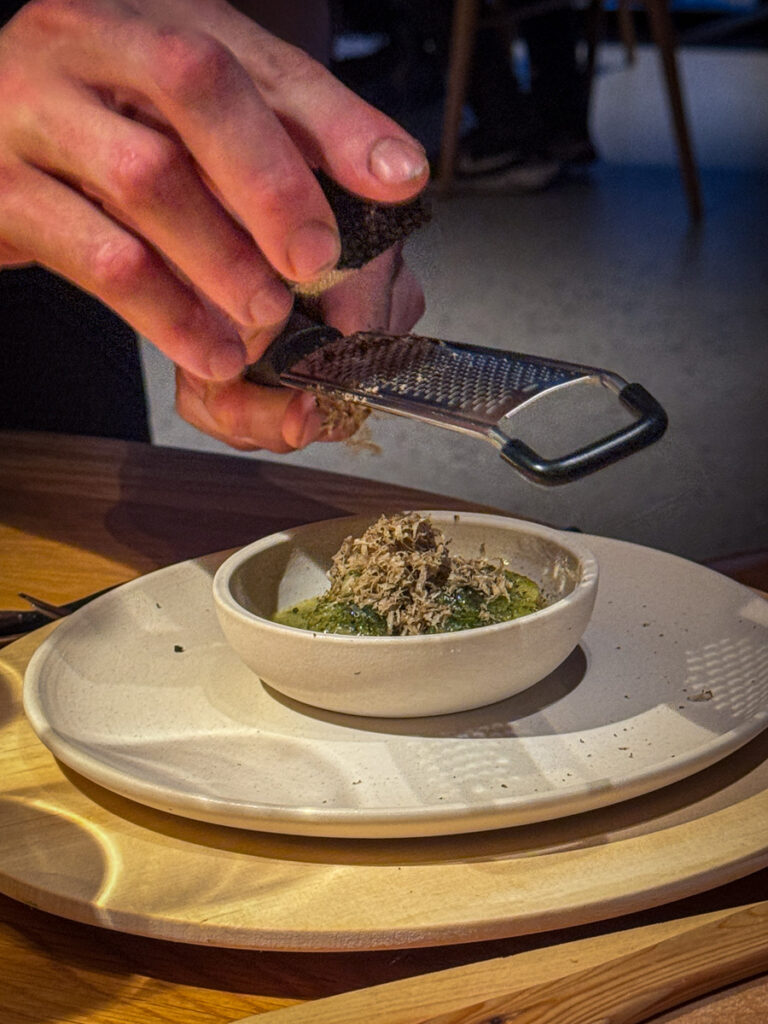 Trøffelen rives over en porsjon med gulløyepoteter i en deilig smørsaus med tangpulver. Jeg har stor sans for potetretter, og denne treffer meg midt i hjertet.