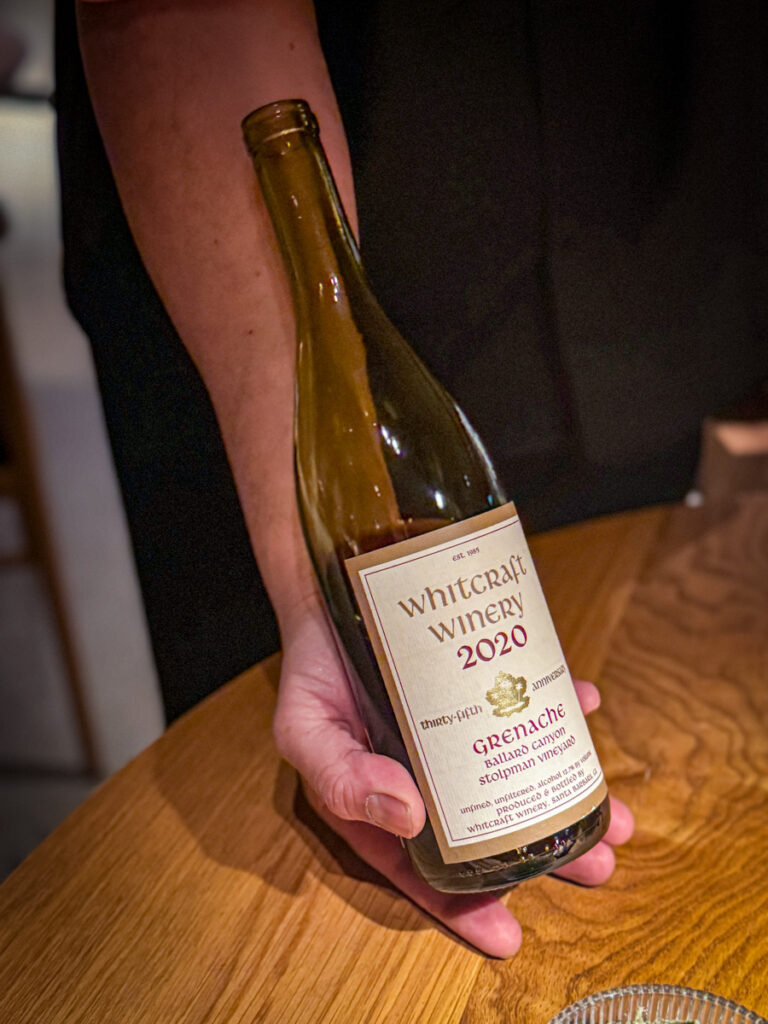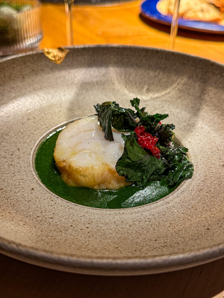 Vi skal over til dagens varme fiskerett. En bløt og vidunderlig Whitcraft Ballard Cyn Stolpman Vineyard Grenache 2020 skjenkes til fisken som er et stykke grillet breiflabb med miso, bergamott og persille. For meg blir denne retten for kjedelig. Fisken er nydelig tilberedt, men den gir meg ikke noe. Valget av breiflabb er også litt vel trygt og jeg håper Hedi Bjerkan vil bruke mindre kommersielle fiskearter fremfor breiflabben som dessverre også står i fare for å bli utryddet på grunn av overfiske. Det er så mye spennende fisk i havet og det vil jeg gjerne se på menyen til Credo en dag.