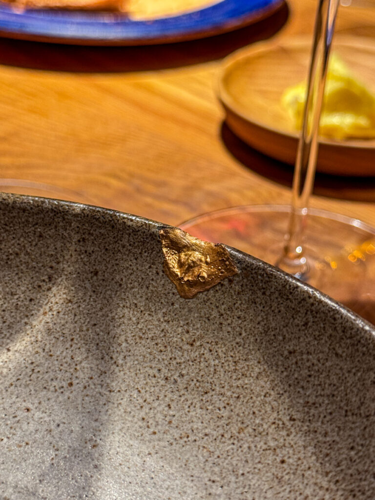 Det jeg dog liker med denne serveringen er at min skål har et skår og at skåret er fremhevet med gull slik man gjør i Japan når noe går i stykker. I stedet for å kaste ting, vier man tid og penger til å reparere det slik at man kan finne skjønnhet i det uperfekte. Teknikken heter Kintsugi.