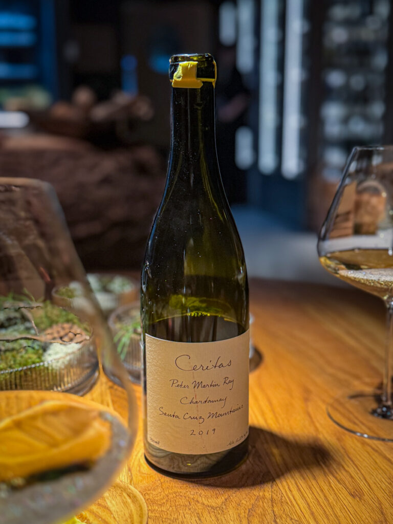 I glasset kommer nok en vin. Denne gang Ceritas 2019 Santa Cruz Mountains Chardonnay Peter Martin Ray Vineyard. Ai, ai, ai, for en vin. Den er også en perfekt match til neste rett som er trønderske sjøkreps med brunet smøremulsjon og en vidunderlig sjøkrepsbuljong som jeg kunne ha drukket en liter av. Keramiker Sissel Wathne har laget serviset som er glasert med knuste sjøkrepsskall fra Credo. Vakkert og stilrent, både design og rett.