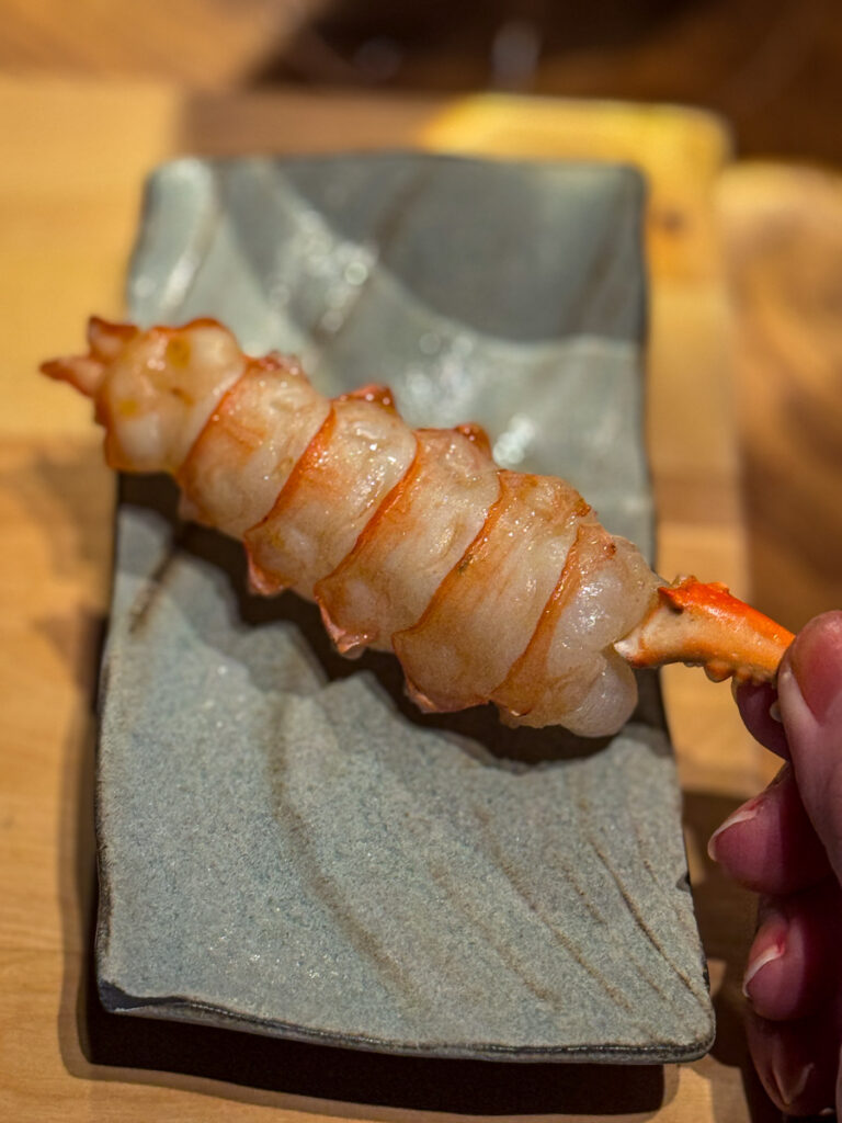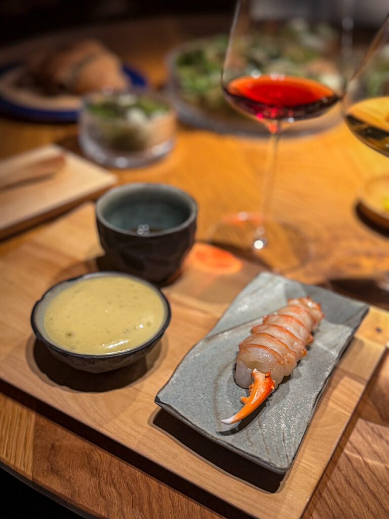 Før vi gyver løs på rettene som allerede står klare, kommer en krustade fylt med sjøkreps og salat og soju. Deilig krønsj i det tynne skallet og fyllet er akkurat passe komprimert. Det smaker deilig, dog velkjent. De andre rettene er mer interessante for min del.