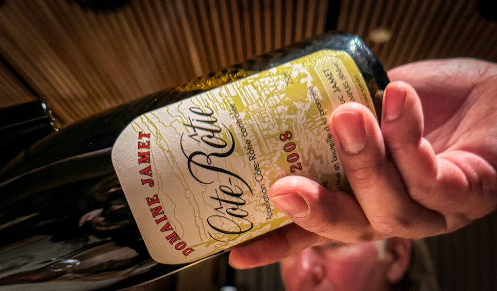 På grunn av en feil på vinen som vi egentlig skal ha i vår prisklasse klinker de til med et glass fra den dyrere menyen. Jamet Cote-Rotie 2008 er en fryd og en absolutt glede å kunne nyte sammen med den fabelaktige hovedretten. Det skal sies at vinene i den ordinære vinpakken er et godt kjøp.