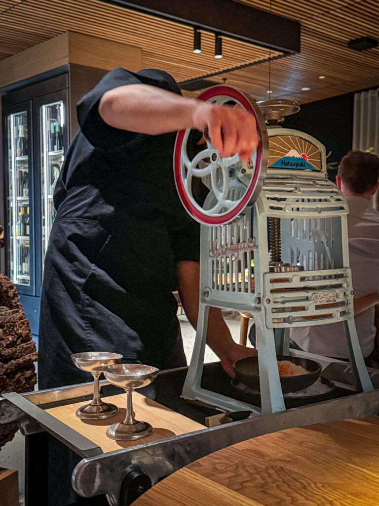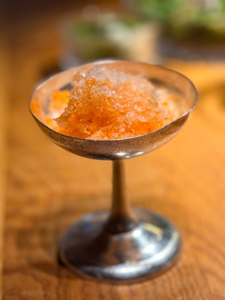 En japansk kakigori-maskin trilles inn fra det innerste kjøkkenet. En isblokk bestående av gulrot, selleri, pepperrot, fermentert kål og stikkelsbær skrapes og i bollen under samles shave ice, slik vi så mange ganger har fått den servert på Hawaii. En tropisk og forfriskende ganerenser som er overført til nordiske smaker er rett og slett et genialt trekk av Bjerkan.