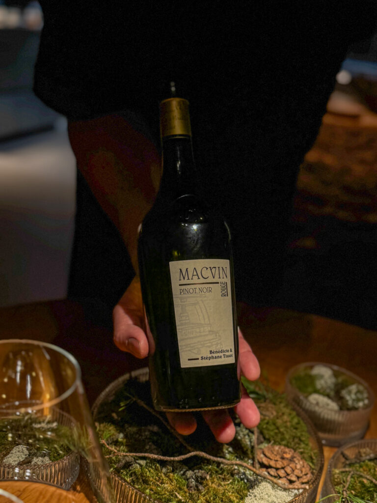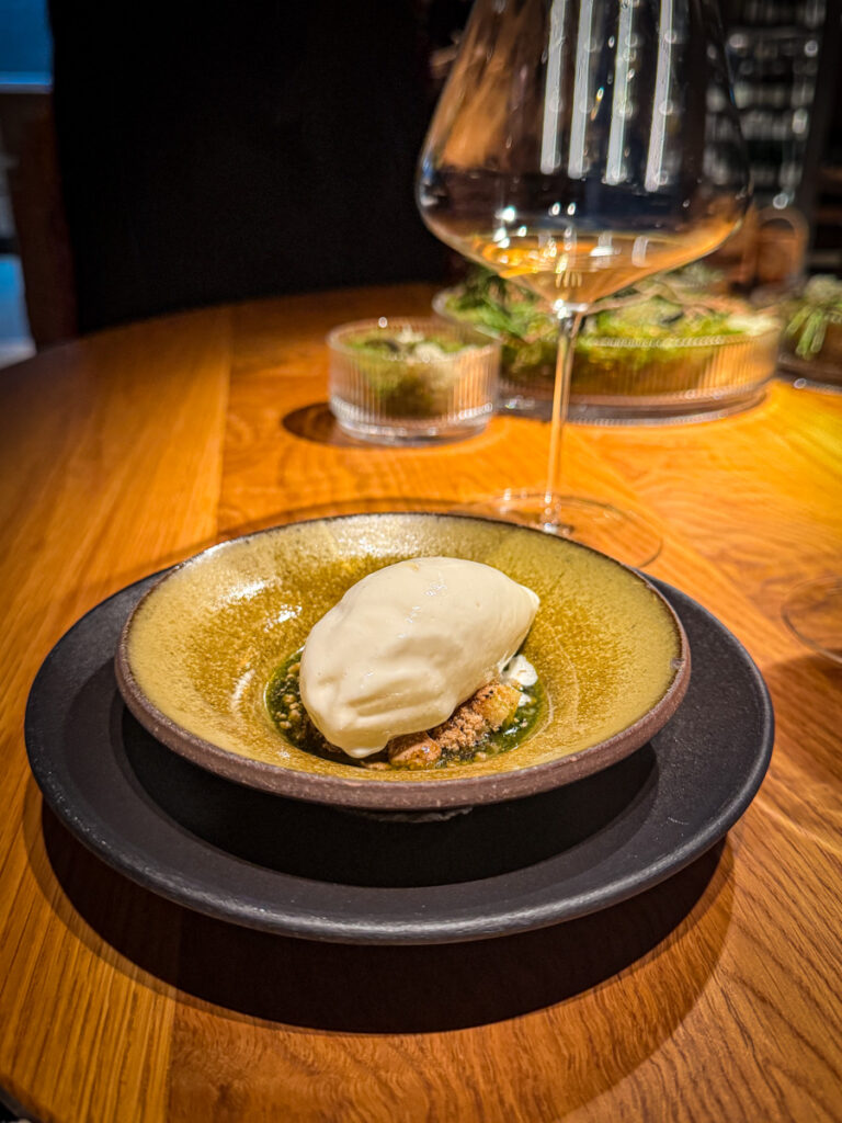 Ny vin serveres, og gjennom hele måltidet har målene vært generøse. Og det stopper ikke her. Siste vinservering er et glass Tissot Macvin Rouge Pinot Noir, et deilig følge til melkeis med kvede, kaffecrumble, lakris og laurbærblad. En god dessert.