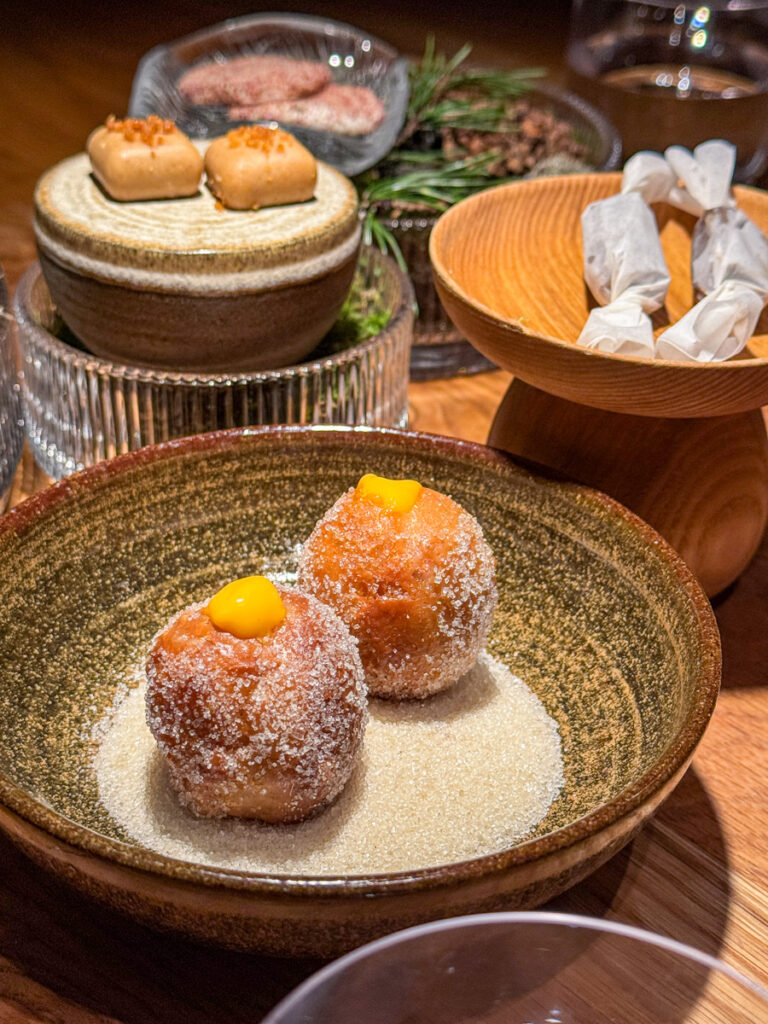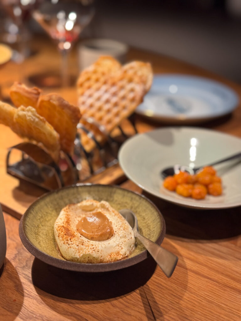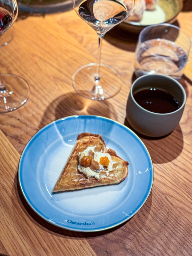 I siste avsnitt av menyen på Credo serveres nok et fullt bord av retter, litt som da vi startet med de kalde sjømatrettene. Vi velger kaffe fra Pala til siste akt. På bordet står det nå sprø vafler med multer, pisket rømme og brunost. I forskjellige skåler står hvit sjokolade med yoghurt, valnøttpralin med sopp og ristet gjær, misokaramell med lakris (OMG!) og digge berlinerboller med tindvedfyll.