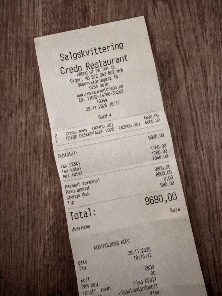 Vi er fornøyde og stolte over å ha fått en restaurant som Credo i nabolaget. Heidi, Kaja og resten av teamet har gjort en formidabel innsats med menyen og restauranten. Det er småting å pirke på, men slik er det alltid når man starter noe nytt. Vi får håpe Michelinguiden tar seg bryet med å besøke Oslo før neste utdeling, for mye tyder på at de droppet de aller fleste byene i Norge i år. Det er nok ingen tvil om at Credo kan få “tilbake” sin stjerne, men at man nok må vente litt lenger på flere stjerner. Jeg er ikke i tvil om at det en gang vil skje, men akkurat nå er det den ene stjernen de bør sikte etter. Og den er definitivt innenfor rekkevidde.