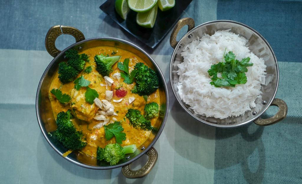 Server curryen med basmatiris og dampet brokkoli til. Et dryss cashewnøtter på toppen, lime og masse frisk koriander hører med.