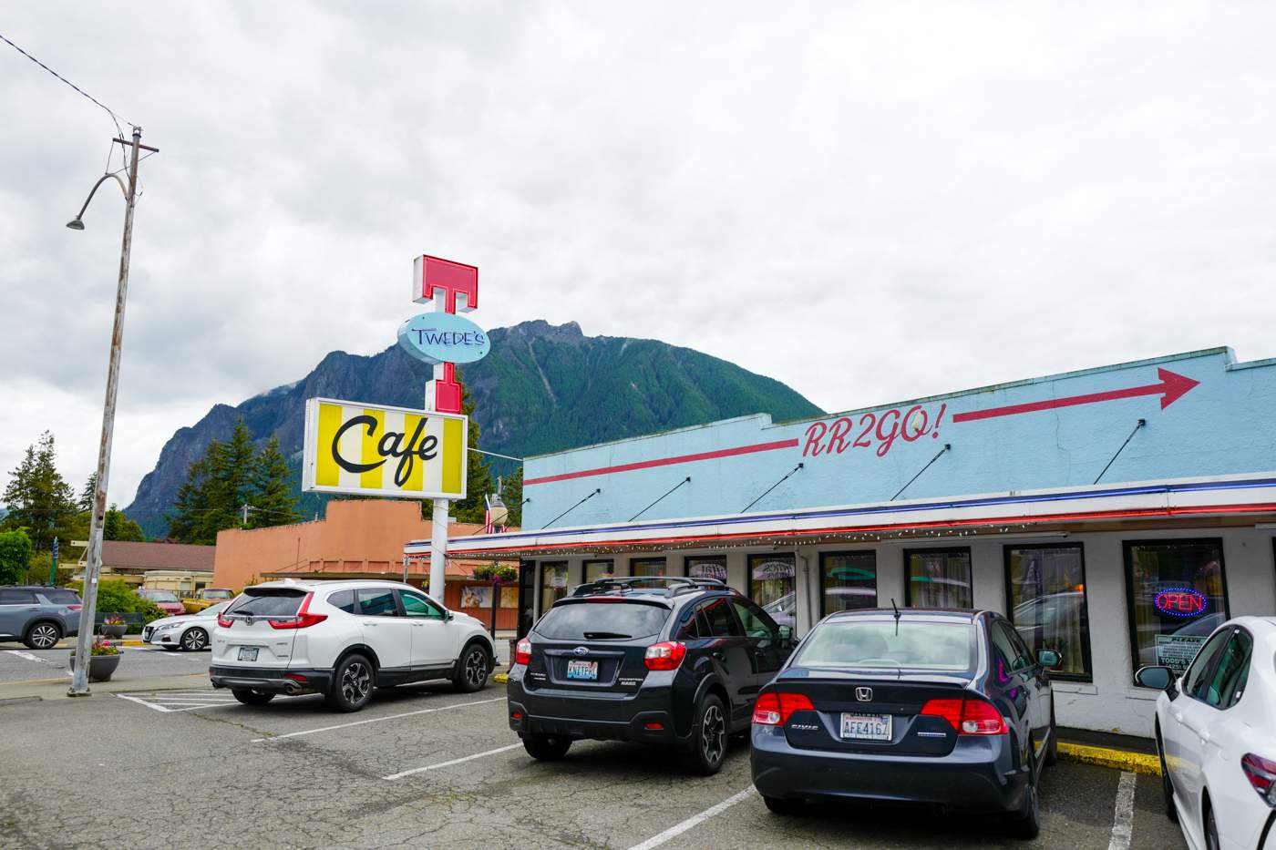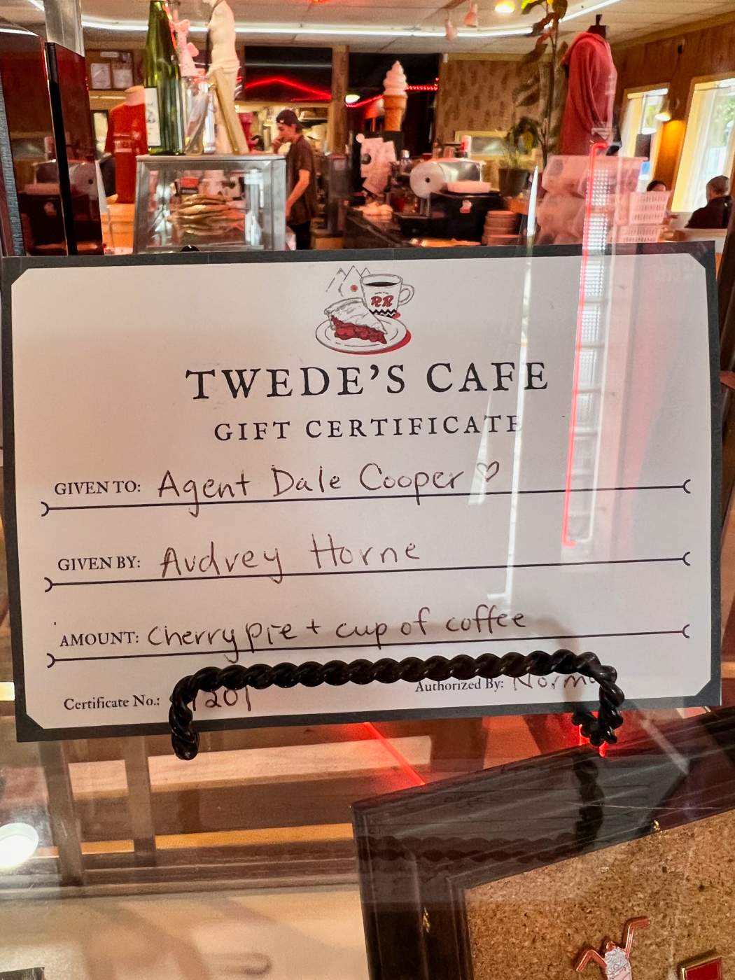 Twede’s Cafe (Double R Diner) er en herlig kafé der lokalbefolkningen vanker pluss noen Twin Peaks-fans som oss. Stedet var utsatt for en brann i 2000, men ble restaurert tilbake til gammel stil. Noen nymotens innslag i kaféen er dog kommet til, som den røde neonfargede installasjonen i taket.