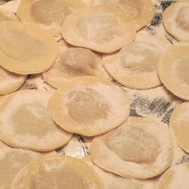 | De ferdige pastaputene kan nå settes et par timer i kjøleskapet før de kokes i saltet, fosskokende vann i noen minutter. Du ser de er ferdige når putene stiger til toppen av kokevannet. |