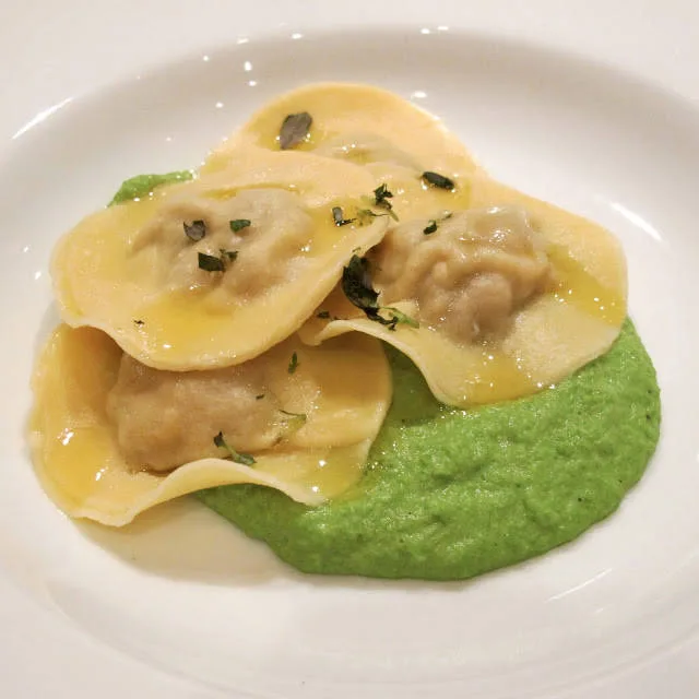 Retten min er pastaputer fylt med krydret medisterdeig, ertepuré og lettbrunet smør. Jeg laget denne som en forrett til meg og venners’ faste «julaften-etter-julaften-en-gang-i-januar»